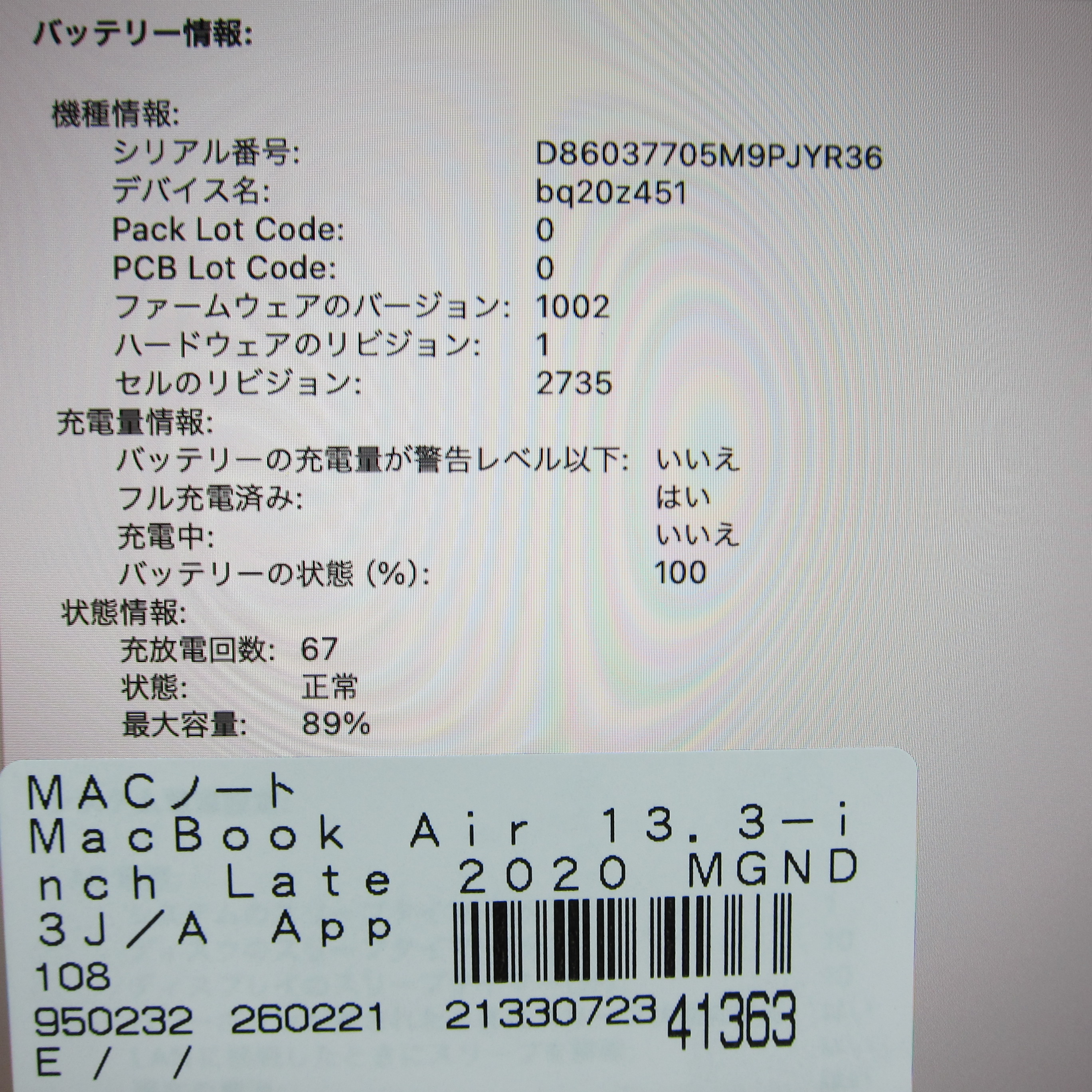 〔中古品〕 MacBook Air 13.3-inch Late-2020 MGND3J/A Apple M1 8コアCPU_7コアGPU 8GB SSD256GB ゴールド 〔14.7 Sonoma〕 [グラフィック:オンボード/JISキーボード]