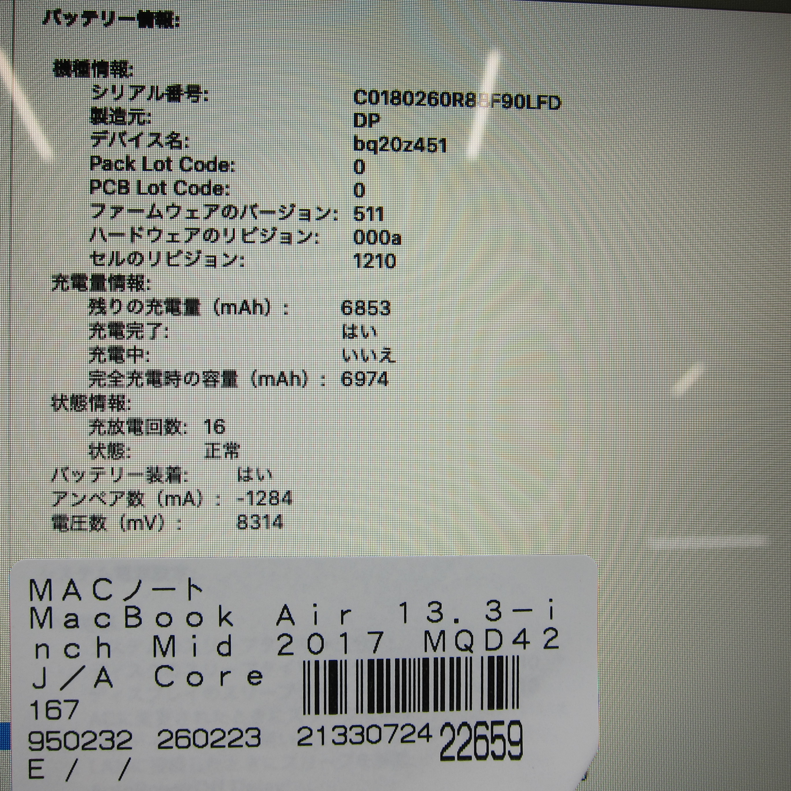 〔中古品〕 MacBook Air 13.3-inch Mid-2017 MQD42J/A Core_i5 1.8GHz 8GB SSD256GB 〔10.15 Catalina〕 [グラフィック:Intel HD Graphics 6000/JISキーボード]