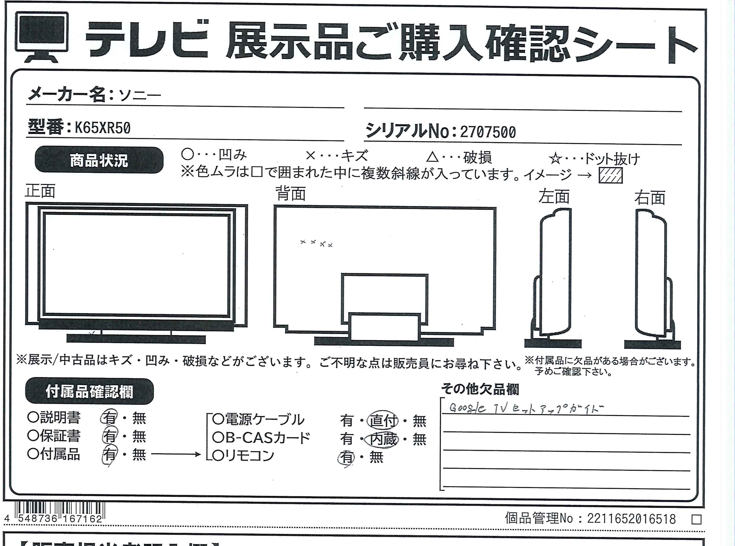 ▼同型番の新品商品はこちら![]() SONY(ソニー) 液晶テレビ BRAVIA(ブラビア) K-65XR50 [65V型 /Bluetooth対応 /4K対応 /BS・CS 4Kチューナー内蔵 /YouTube対応] ¥277,200(税込) 0ポイントサービス 在庫あり |