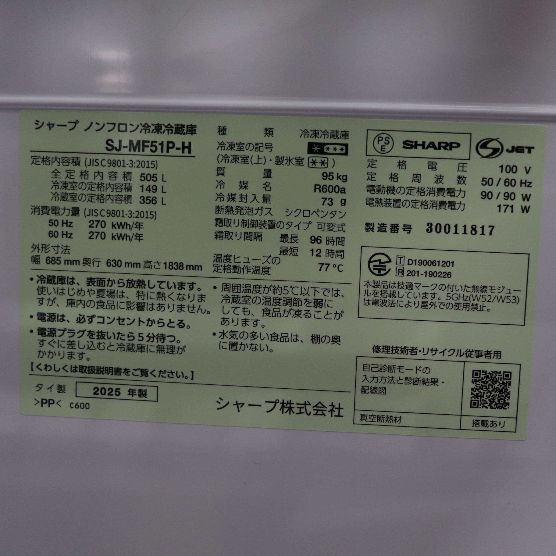 〔展示品〕 プラズマクラスター冷蔵庫 ダスクダークメタル SJ-MF51P-H [幅68.5cm /505L /6ドア /観音開きタイプ]