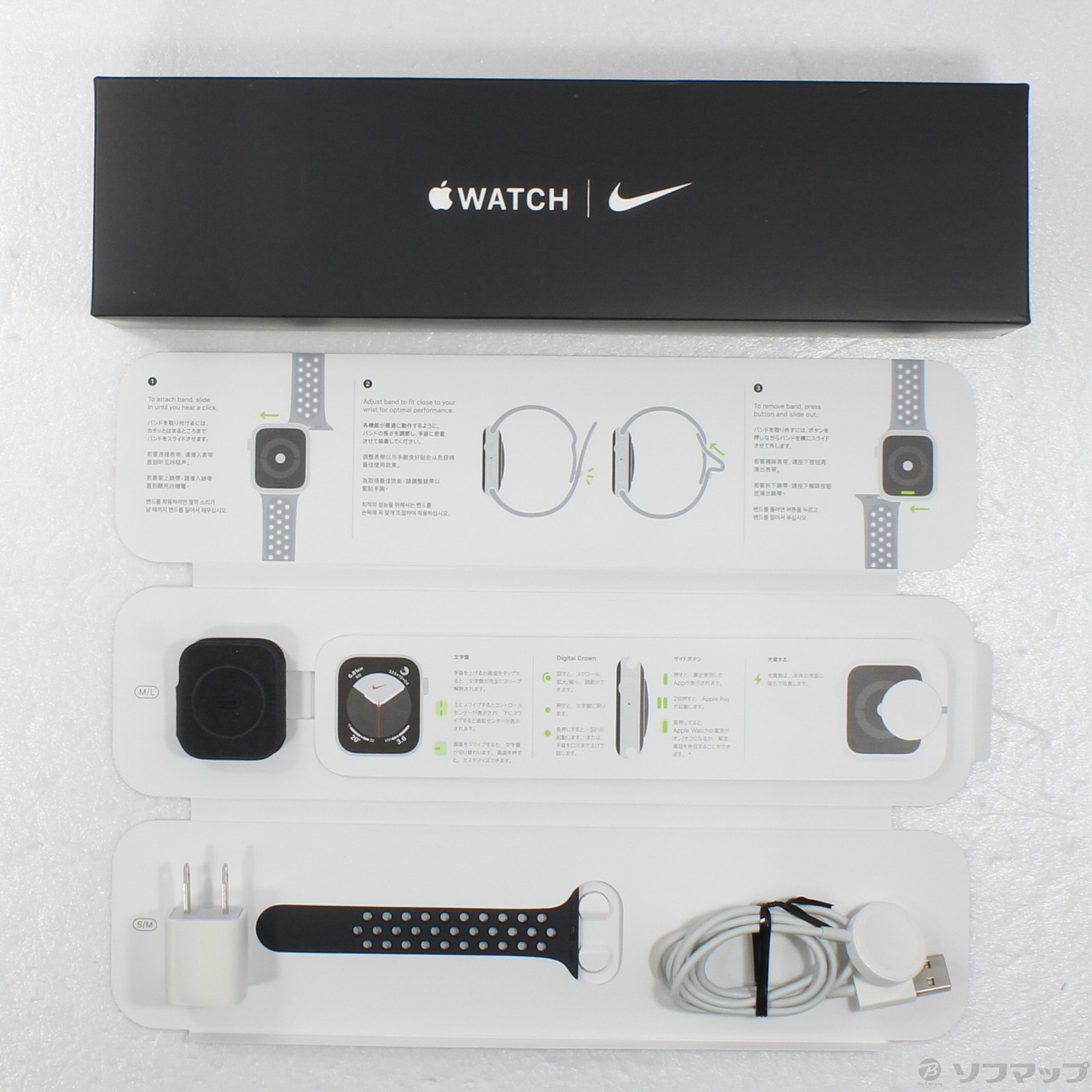 中古商品ランクについて 付属品・商品状態について 〔付属品〕外箱、説明書、USB電源アダプタ、アンスラサイトブラックNikeスポーツバンド(S/M)、アンスラサイトブラックNikeスポーツバンド(M/L)、磁気充電ケーブル
