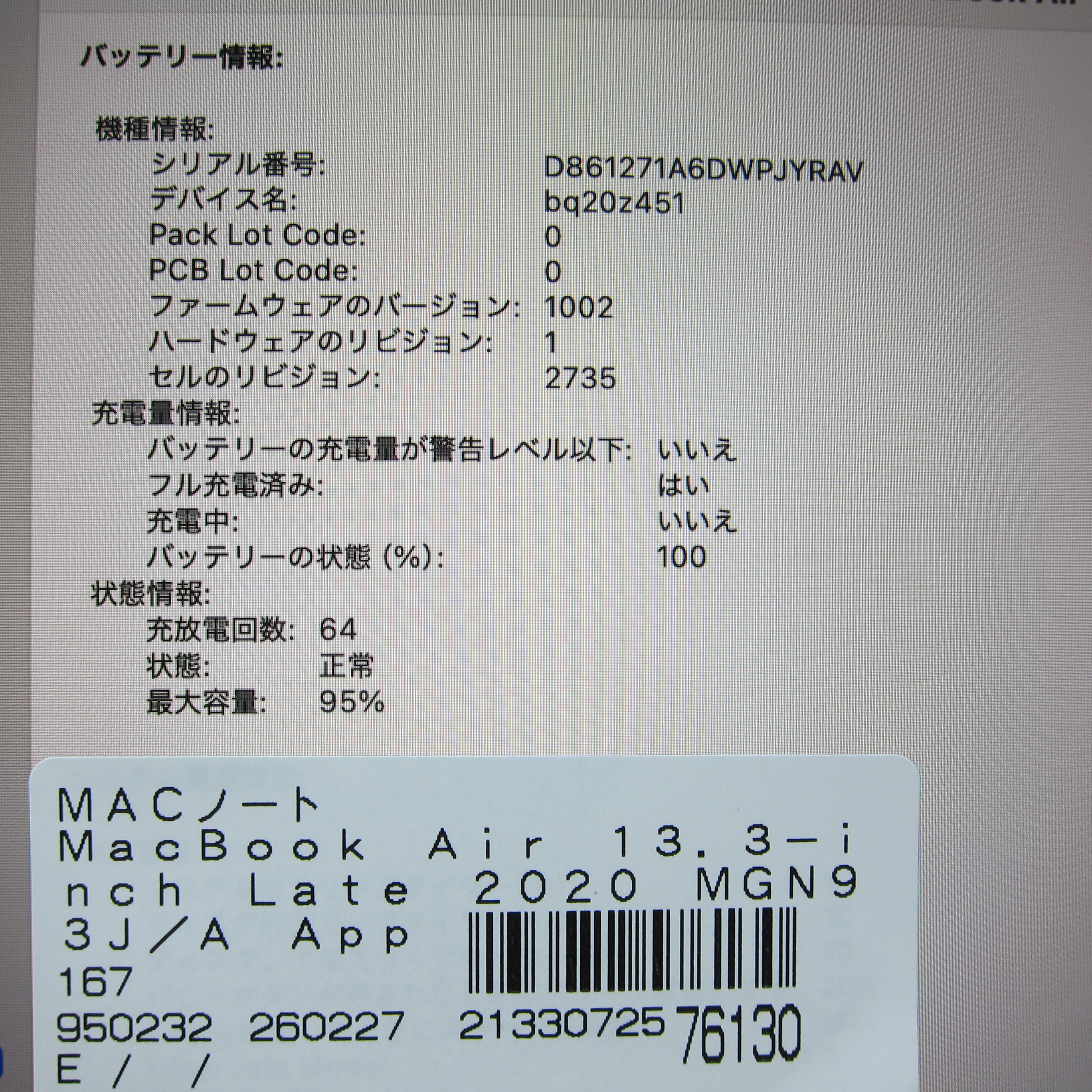 〔中古品〕 MacBook Air 13.3-inch Late-2020 MGN93J/A Apple M1 8コアCPU_7コアGPU 8GB SSD256GB シルバー 〔15.3 Sequoia〕 [グラフィック:オンボード/JISキーボード]