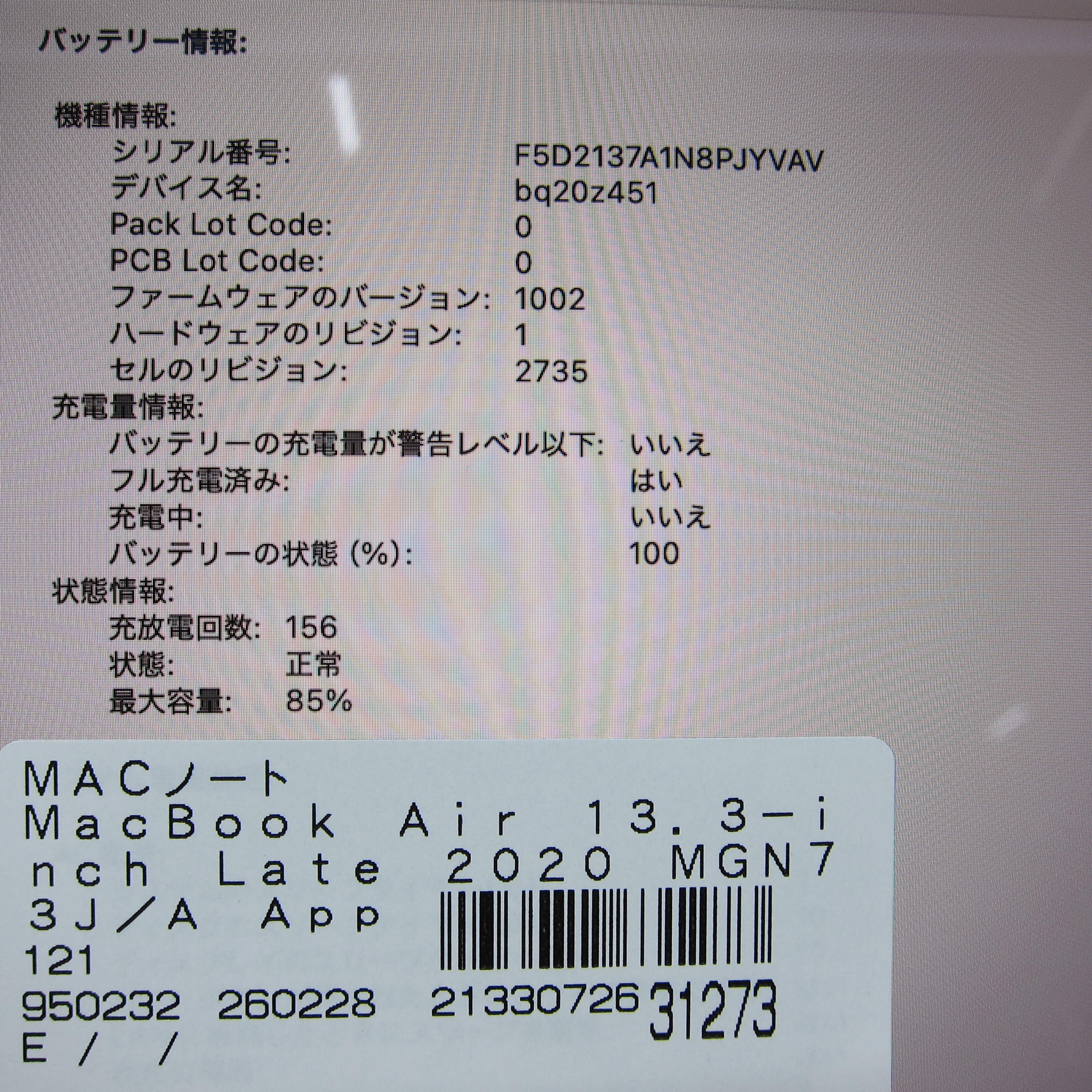 〔中古品〕 MacBook Air 13.3-inch Late-2020 MGN73J/A Apple M1 8コアCPU_8コアGPU 8GB SSD512GB スペースグレイ 〔15.3 Sequoia〕 [グラフィック:オンボード/JISキーボード]