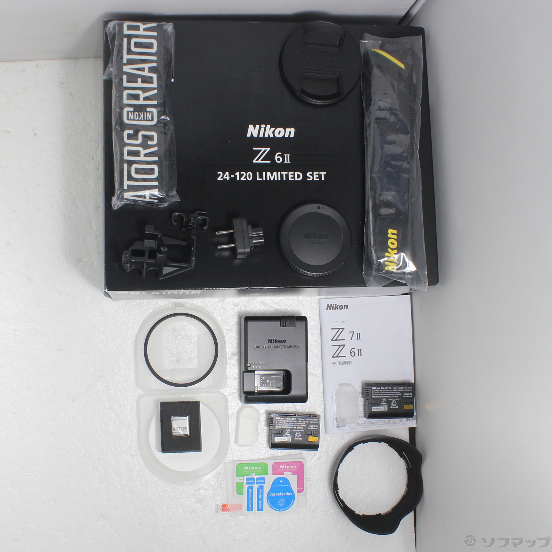 Z6II本体、レンズ NIKKOR Z 24-120mm f/4 S、バッテリー EN-EL15c、保護フィルター77mm、Nikon CREATORS ストラップとアクセサリーシューカバーのセットです。
