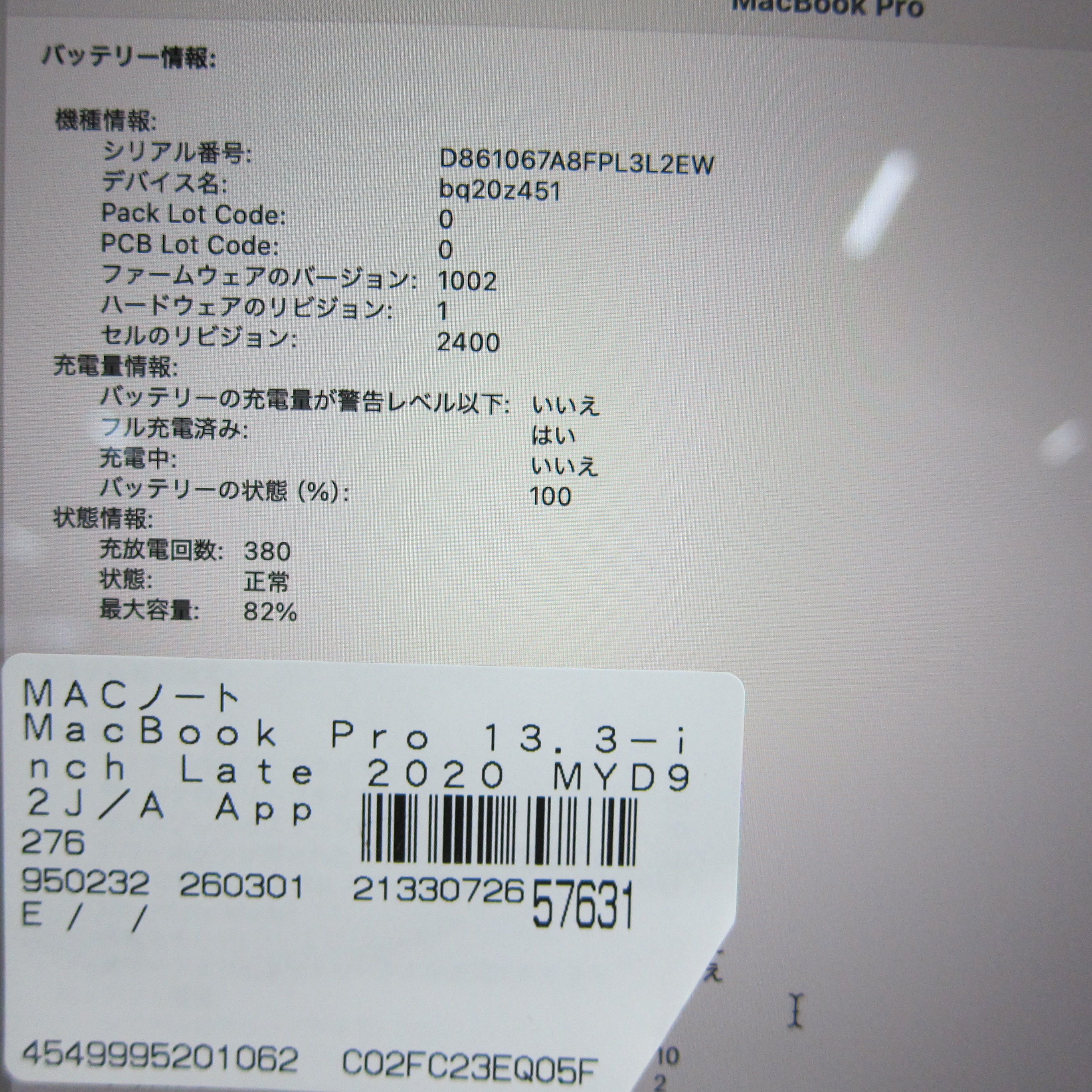 〔中古品〕 MacBook Pro 13.3-inch Late-2020 MYD92J/A Apple M1 8コアCPU_8コアGPU 8GB SSD512GB スペースグレイ 〔15.3 Sequoia〕 [グラフィック:オンボード/JISキーボード]
