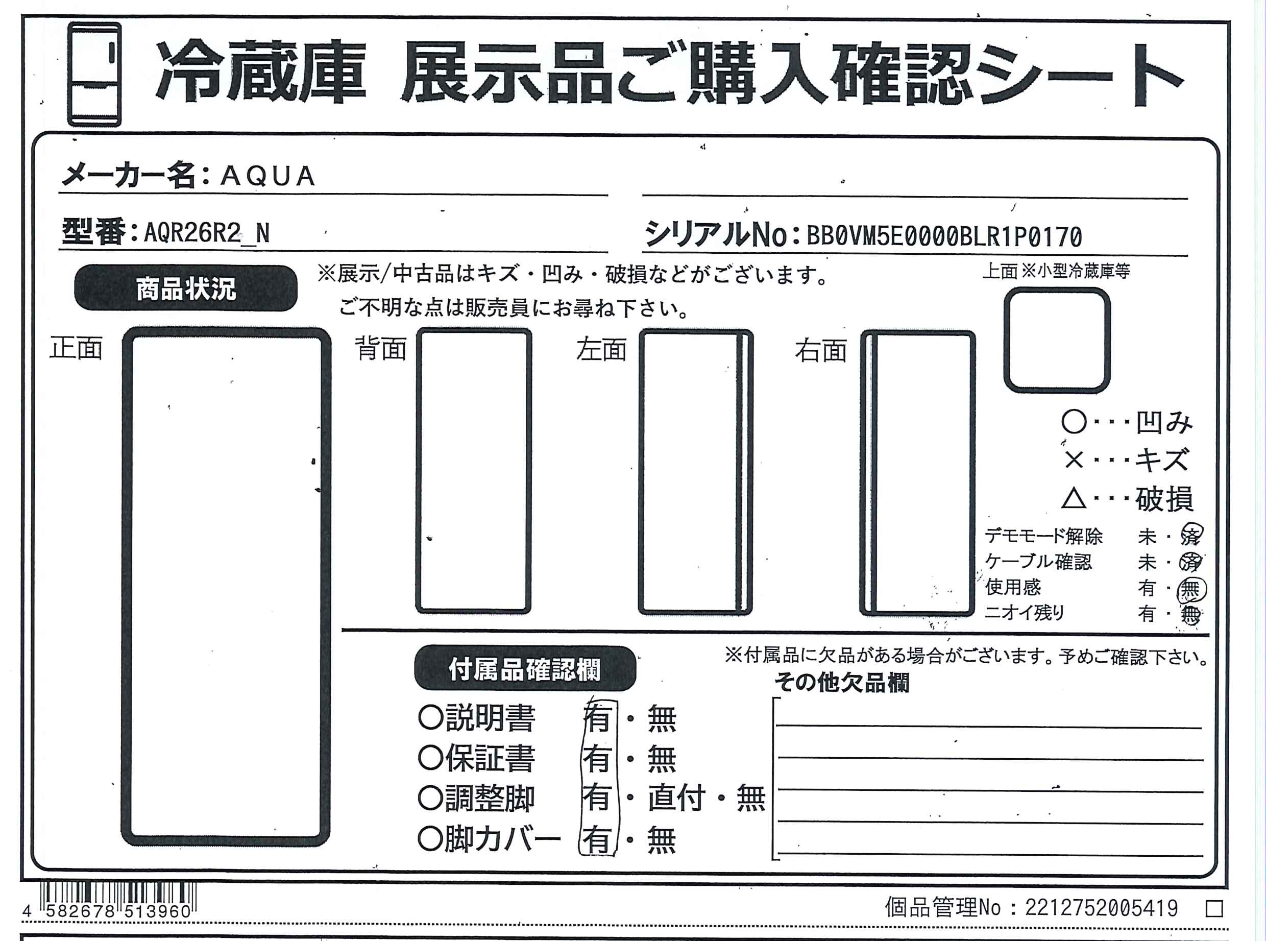 中古商品ランクについて 付属品・商品状態について 〔付属品〕説明書、ガラス棚(ハーフ)×2、チルドルームケース、ワイドマルチポケット、卵皿&チューブスタンド、ミニボトルポケット、ボトル&ドレッシングポケット、冷凍ケース、製氷皿、氷スコップ、バスケット(冷凍室)、野菜ケース、バスケット(野菜室)、おそうじ栓、キックプレート、調整脚×2