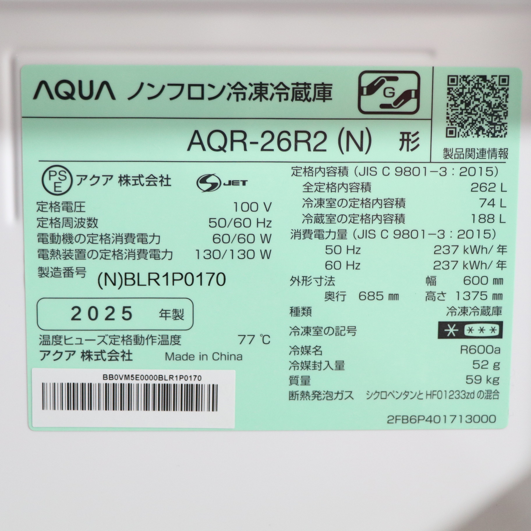 〔展示品〕 冷蔵庫 AQUA ブライトシャンパン AQR-26R2(N) [幅60cm /262L /3ドア /右開きタイプ /2025年]