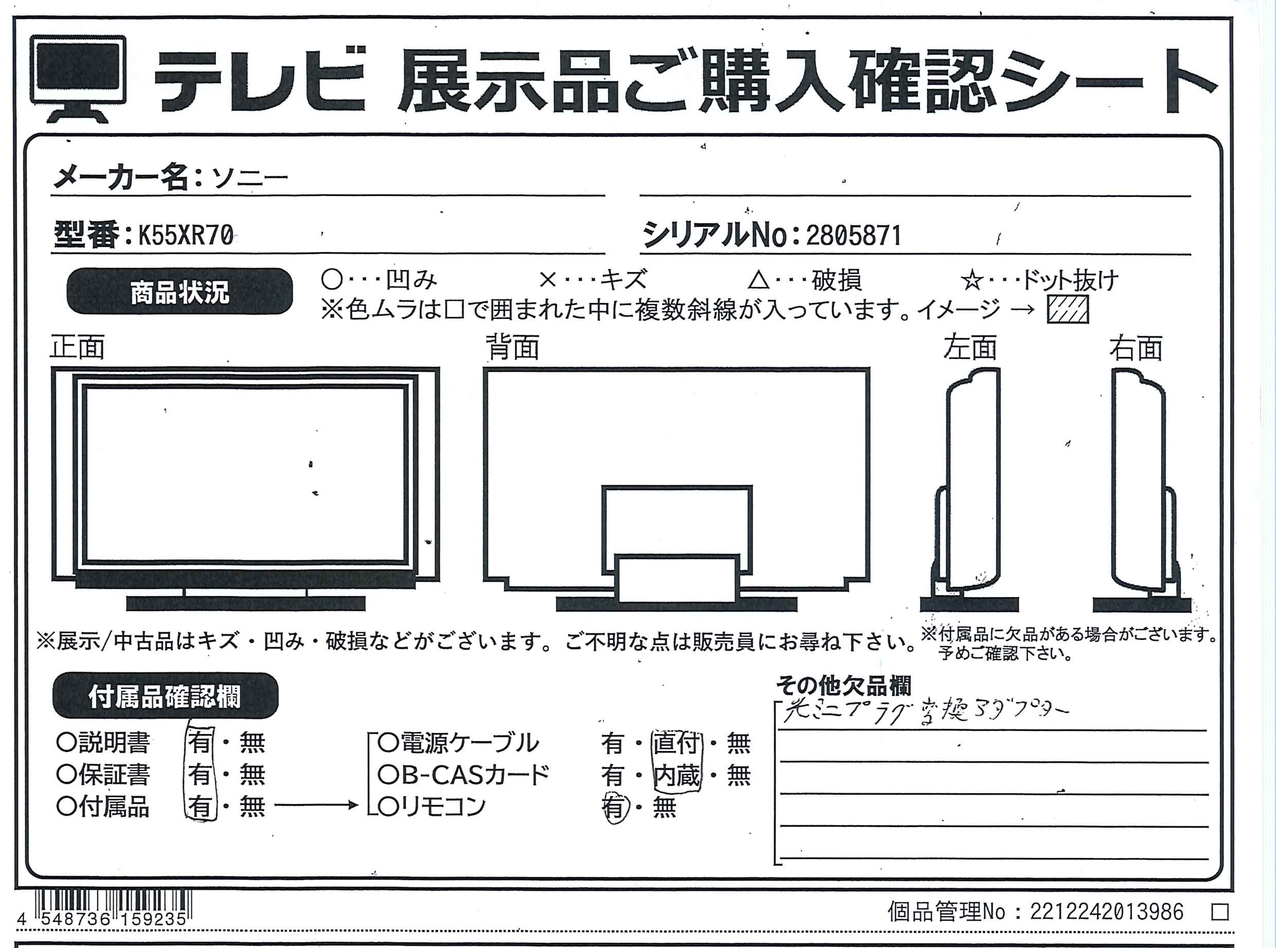 中古商品ランクについて 付属品・商品状態について 〔付属品〕取扱説明書、組立・設置ガイド、製品登録のおすすめ、リモコン、リモコン用単4形乾電池×2、スタンド左右一式(SB)、スペーサー(VS)、転倒防止ベルト一式(FB)