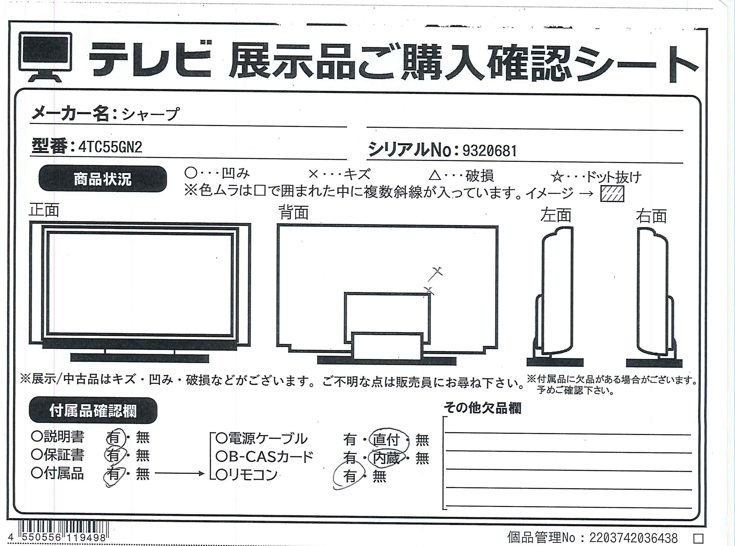 中古商品ランクについて 付属品・商品状態について 〔付属品〕取扱説明書、かんたん使い方ガイド、リモコン、単4形乾電池×2、スタンドベース、スタンド取付金具、スタンドカバー、スタンド組立用ネジ(長さ M5×25mm)×4、スタンド取付用ネジ(長さ M5×12mm)×4、スタンド回転ロックネジ、転倒防止ベルト、転倒防止ベルトテレビ取付用ネジ[黒(長さ M4×8mm)]、転倒防止ベルトテレビ台固定用ネジ[シルバー(長さ M4×16mm)]