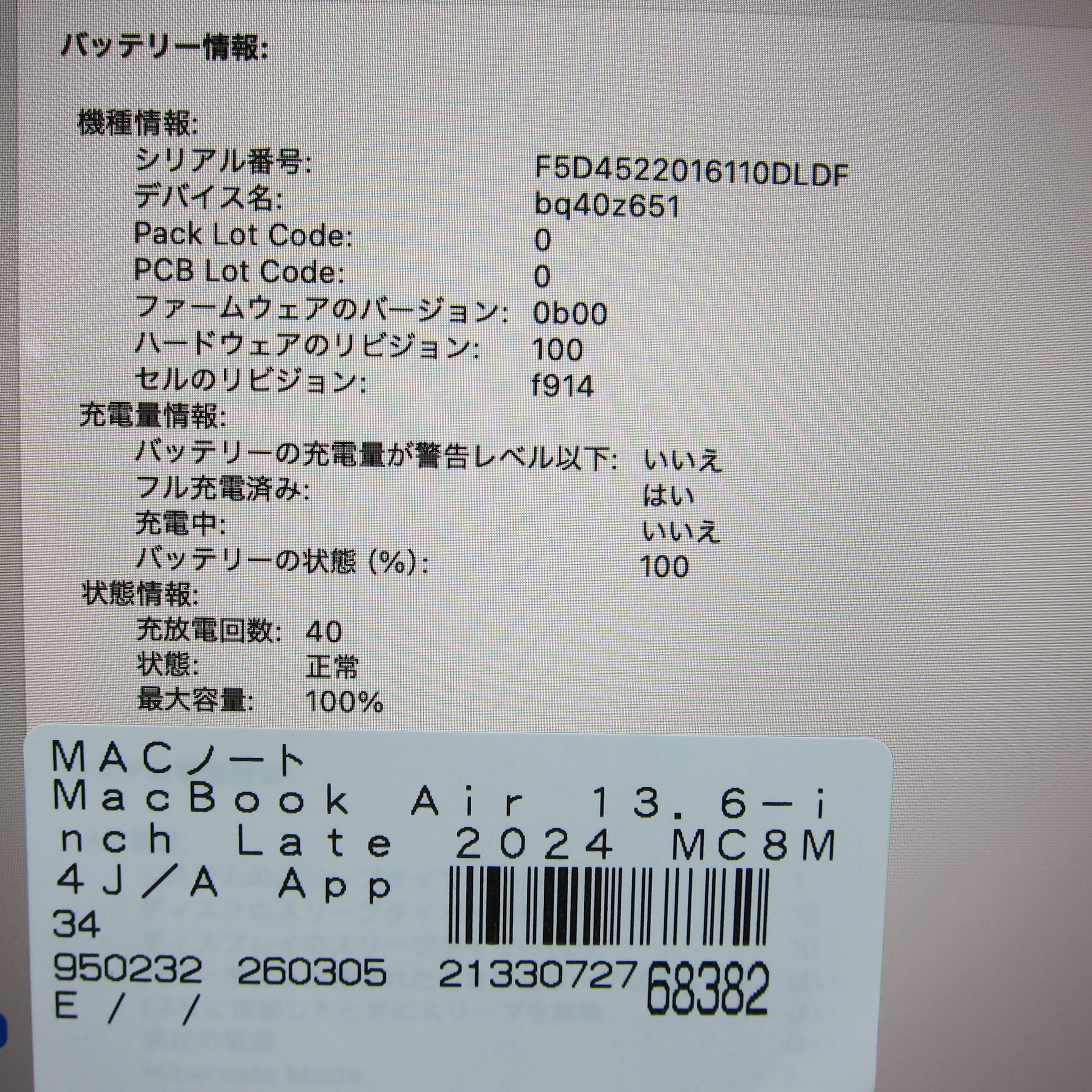 〔中古品〕 MacBook Air 13.6-inch Late-2024 MC8M4J/A Apple M3 8コアCPU_10コアGPU 24GB SSD512GB スペースグレイ 〔15.3 Sequoia〕 [グラフィック:オンボード/JISキーボード]