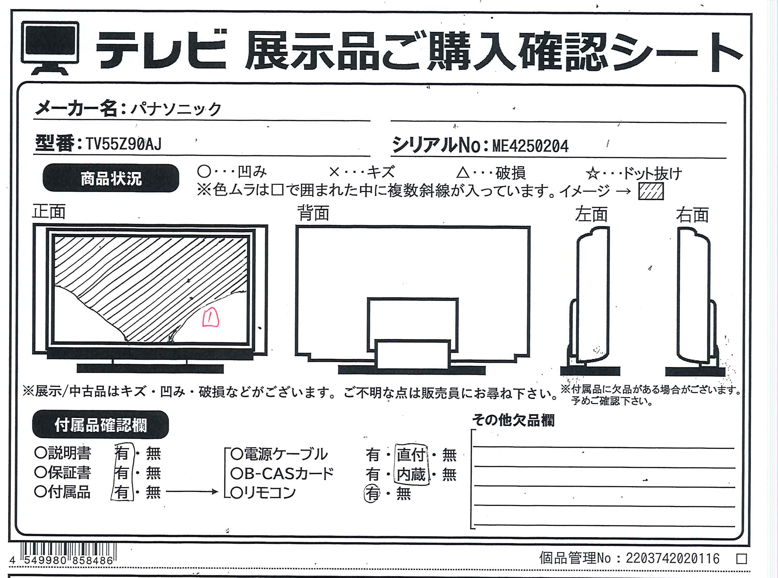 中古商品ランクについて 付属品・商品状態について 〔付属品〕取扱説明書、リモコン、リモコン用乾電池×2、転倒防止スタンド、本体固定用ねじ(M4)×4、ケーブルカバー、転倒・落下防止部品一式