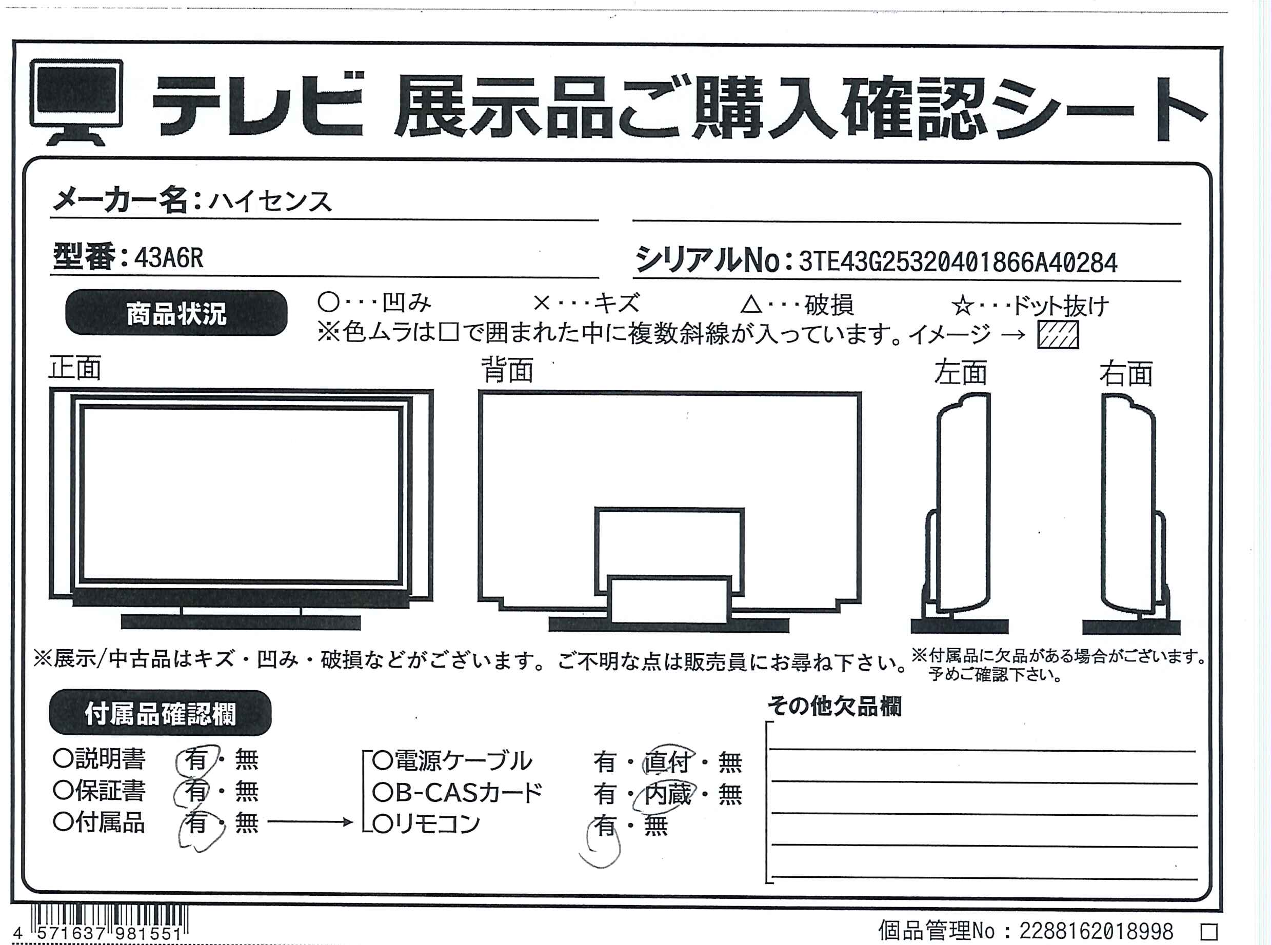 中古商品ランクについて 付属品・商品状態について 〔付属品〕説明書、電源コード、単四形乾電池、リモコン、転倒防止ベルト一式、スタンド一式