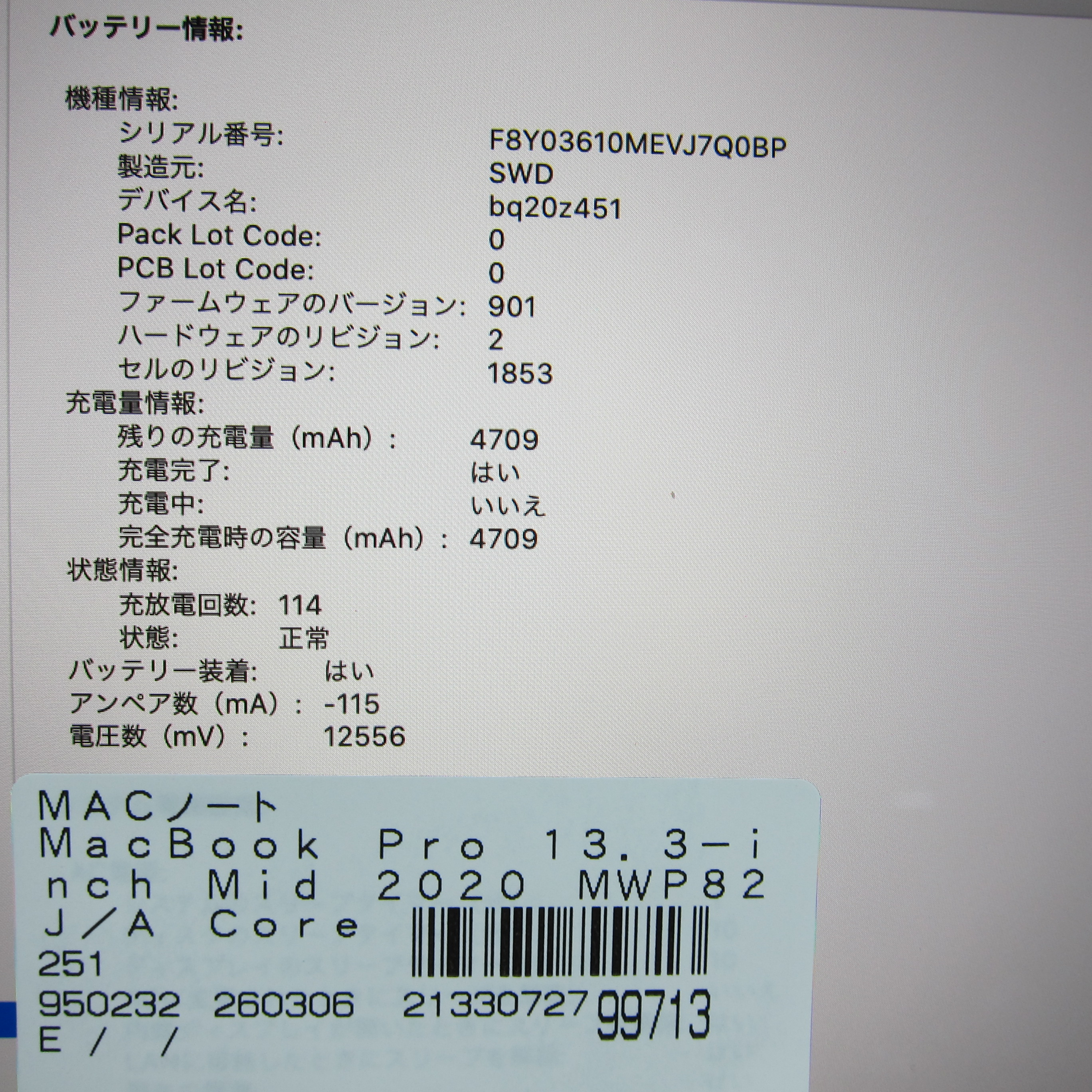 〔中古品〕 MacBook Pro 13.3-inch Mid-2020 MWP82J/A Core_i5 2.0GHz 16GB SSD1TB シルバー 〔10.15 Catalina〕 [グラフィック:Intel Iris Plus Graphics/JISキーボード]