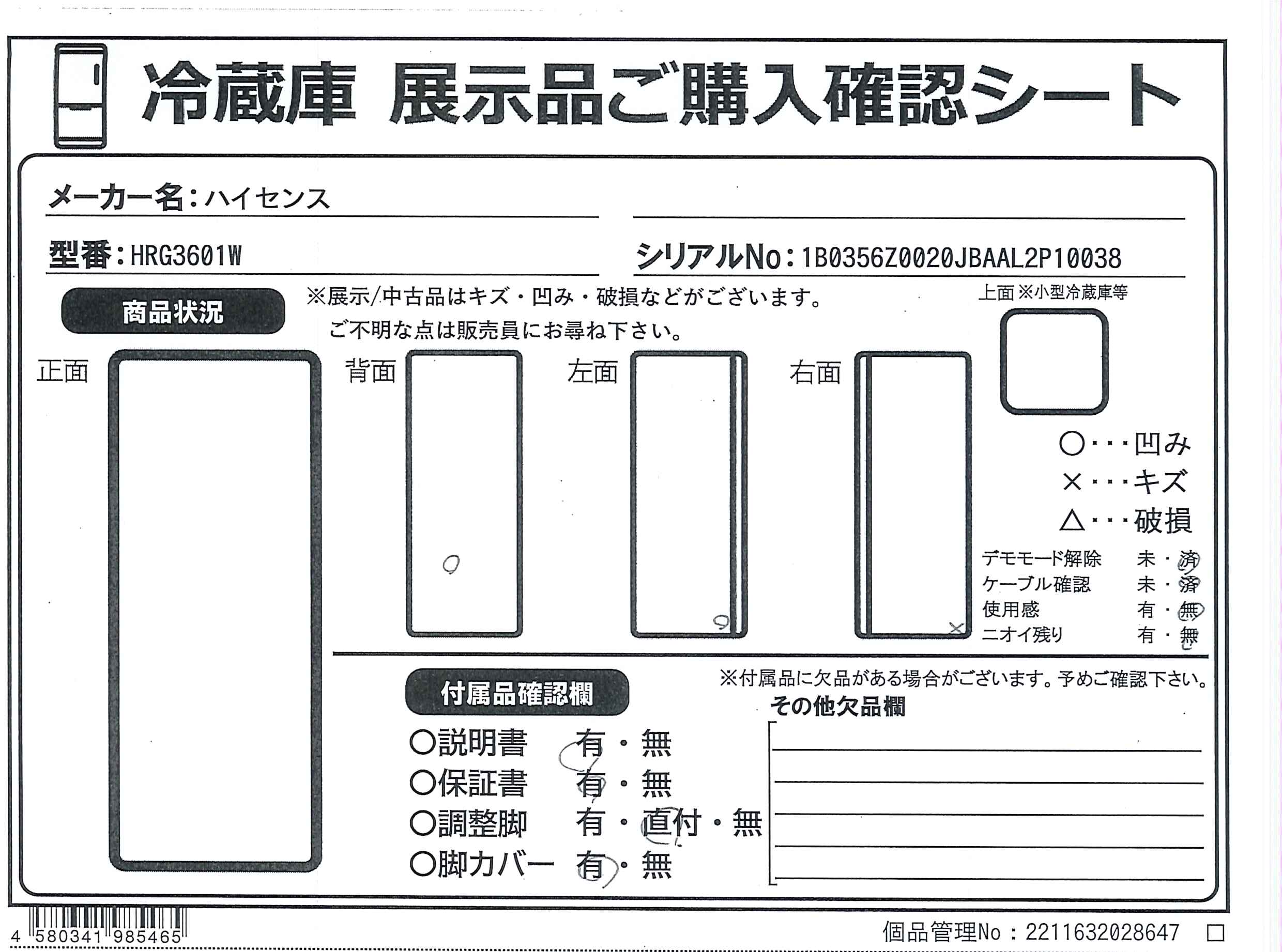 中古商品ランクについて 付属品・商品状態について 〔付属品〕説明書、脚カバー、卵トレイ、トレイ、小物入れ、給水タンク一式、アルミプレート、アイスシャベル、防音シート、調節脚×2、穴カバー、蒸発皿、製氷皿