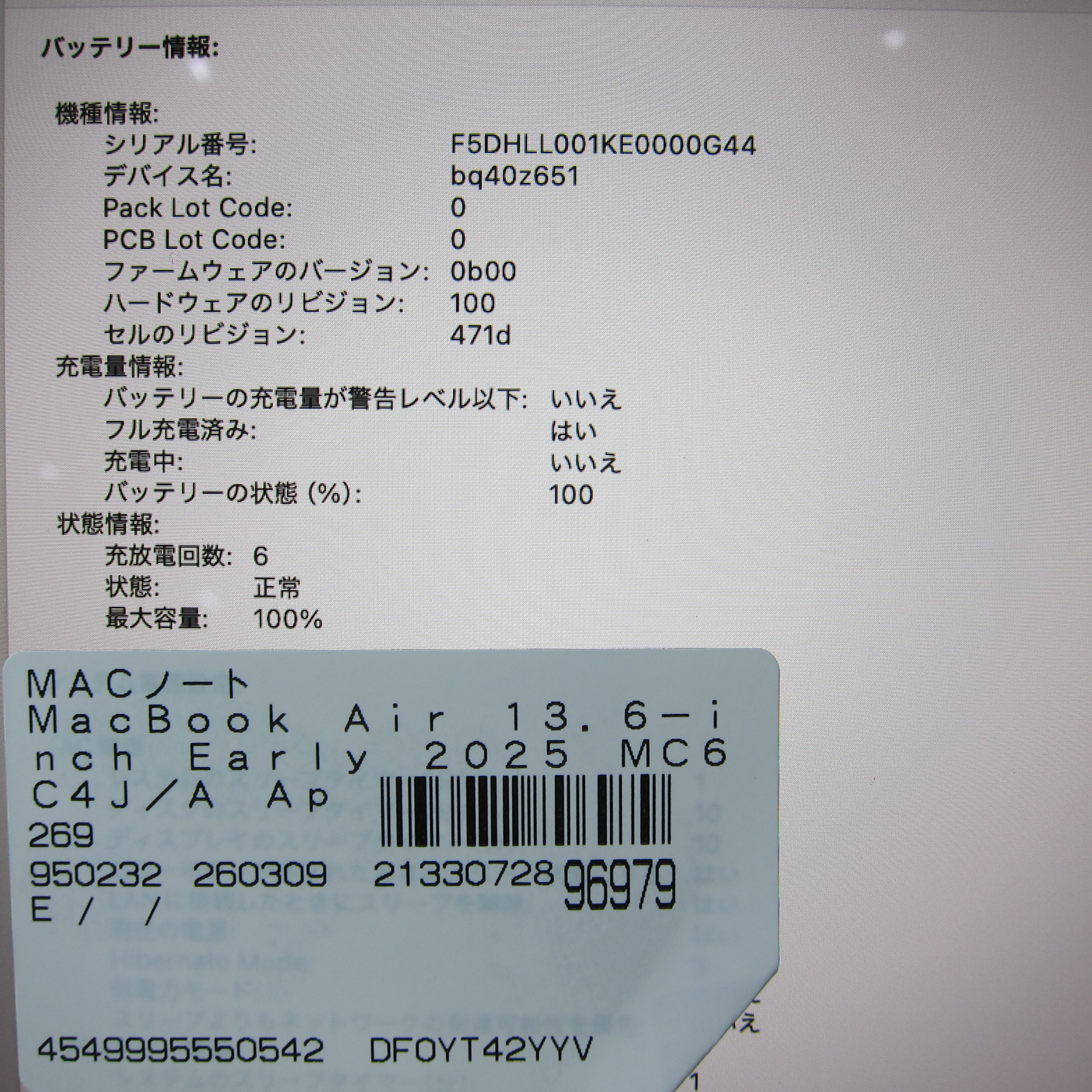〔中古品〕 MacBook Air 13.6-inch Early-2025 MC6C4J/A Apple M4 10コアCPU_10コアGPU 24GB SSD512GB ミッドナイト 〔15.7 Sequoia〕 [グラフィック:オンボード/JISキーボード]