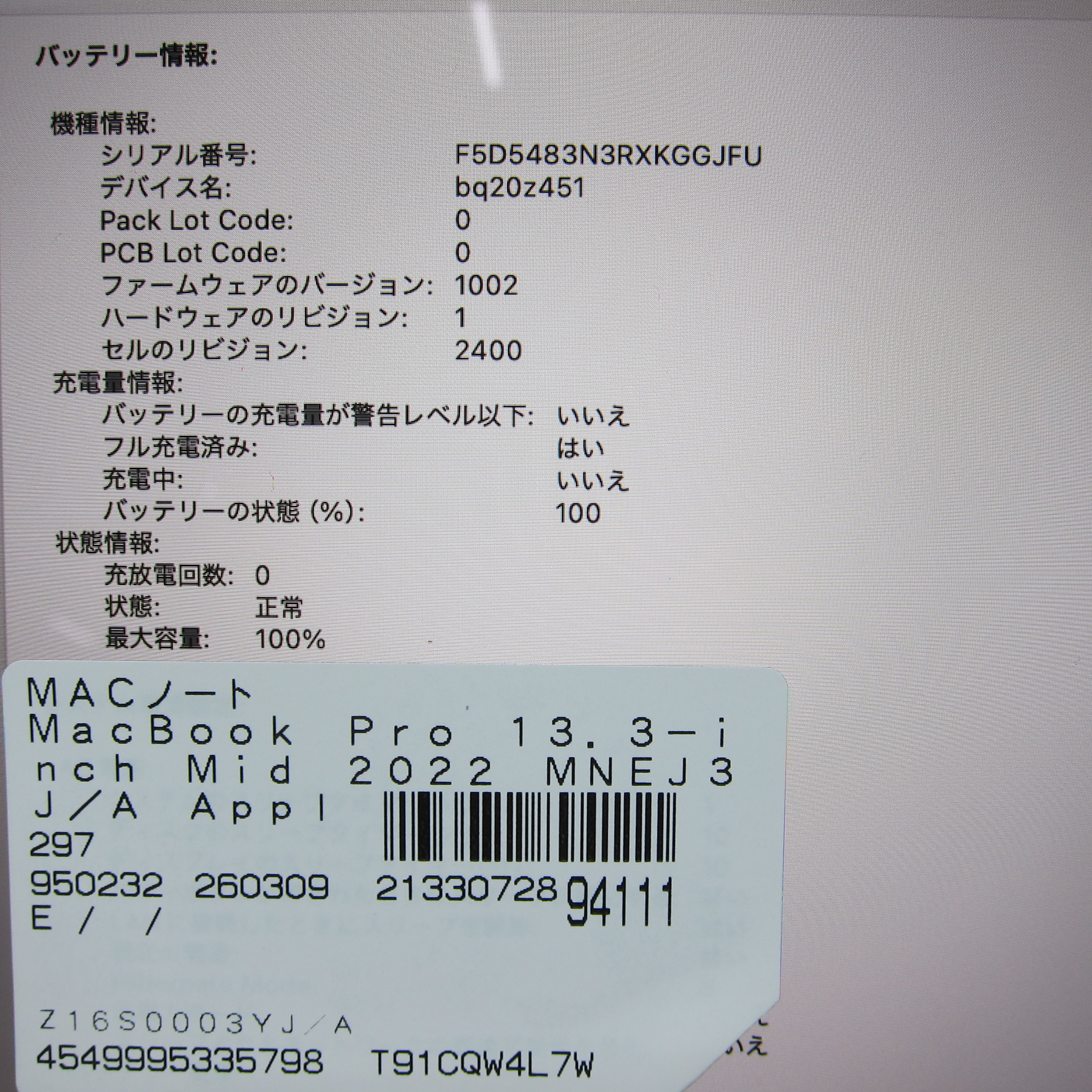 〔中古品〕 MacBook Pro 13.3-inch Mid-2022 MNEJ3J/A Apple M2 8コアCPU_10コアGPU 16GB SSD1TB スペースグレイ 〔15.3 Sequoia〕 [グラフィック:オンボード/JISキーボード]