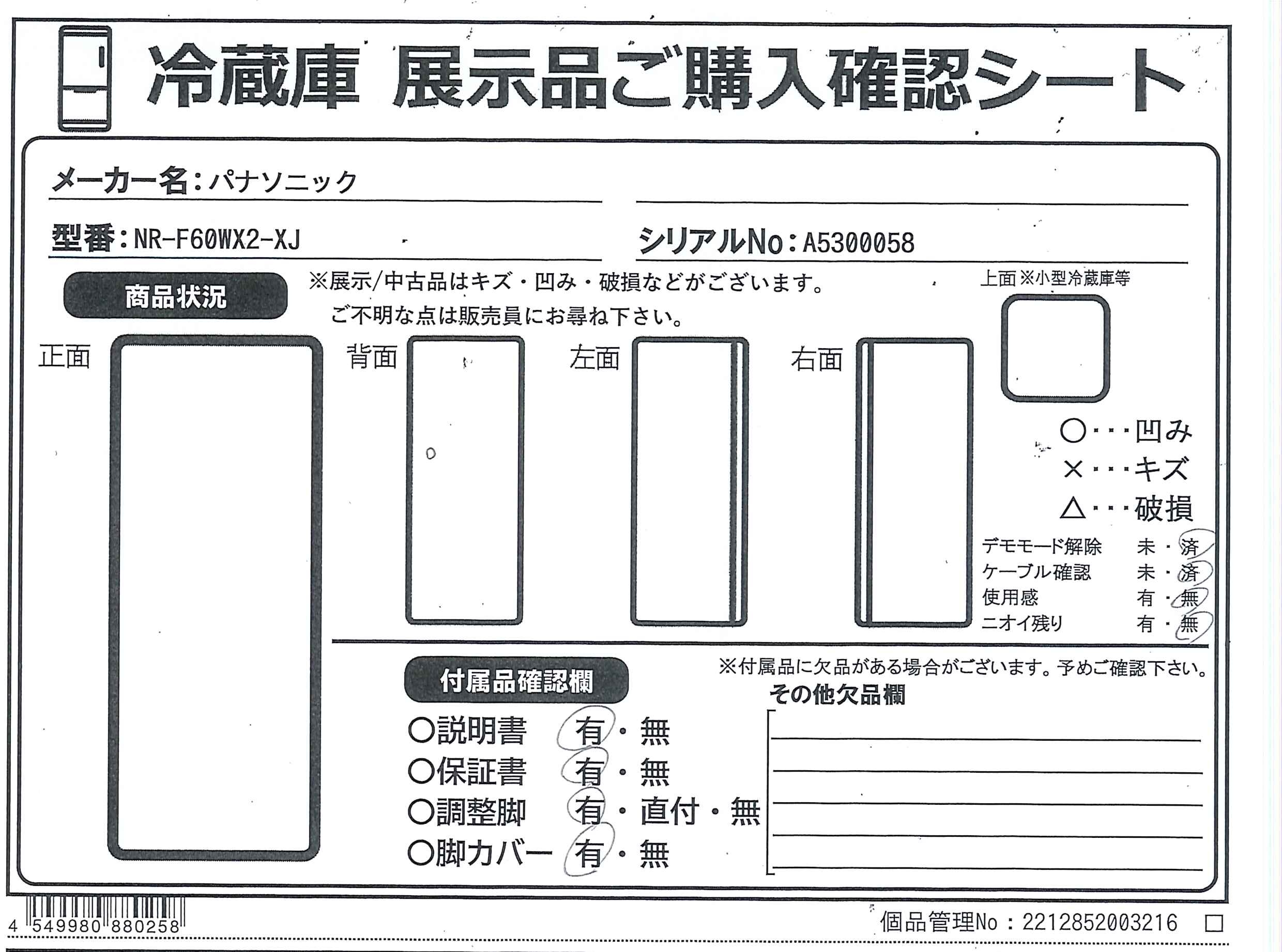 中古商品ランクについて 付属品・商品状態について 〔付属品〕取扱説明書、脚カバー、調節脚×2、給水タンク、卵トレイ、アルミ冷却プレート、上段ケースカバー×2、仕切り、アルミプレート、モイスチャーコントロールプレート、モイスチャーコントロールフィルター、ボトルサポーター、アイスシャベル、防音マット