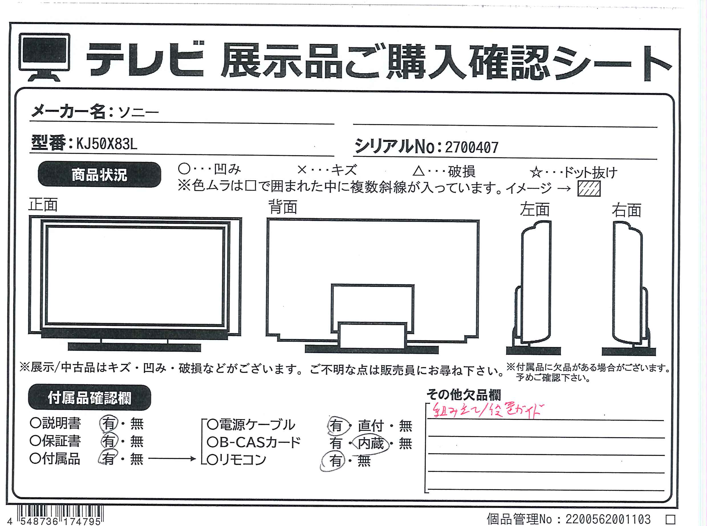 中古商品ランクについて 付属品・商品状態について 〔付属品〕説明書、標準スタンド、リモコン、単4形乾電池(2個)、転倒防止用固定ベルト一式、ACコ電源コード