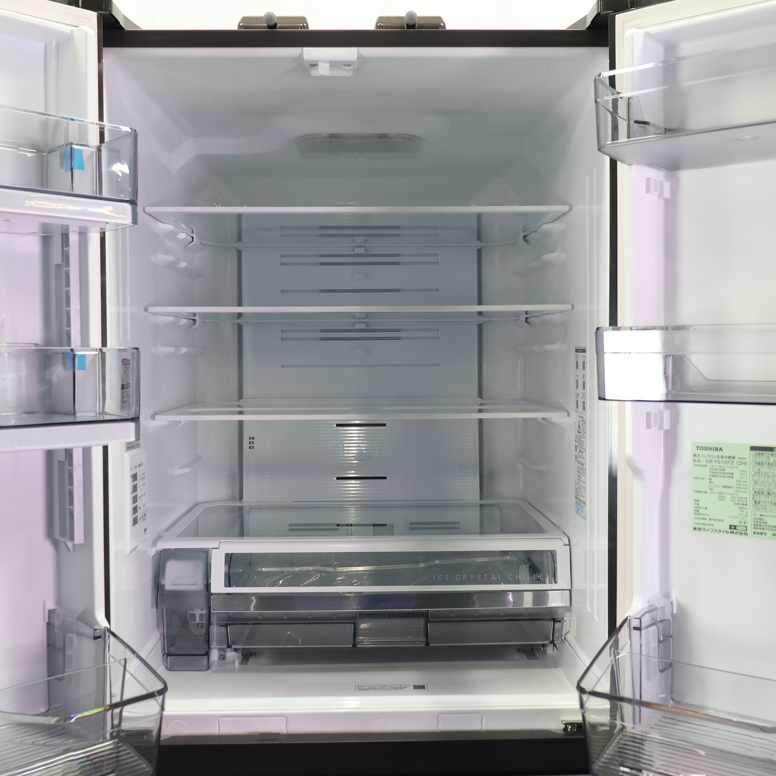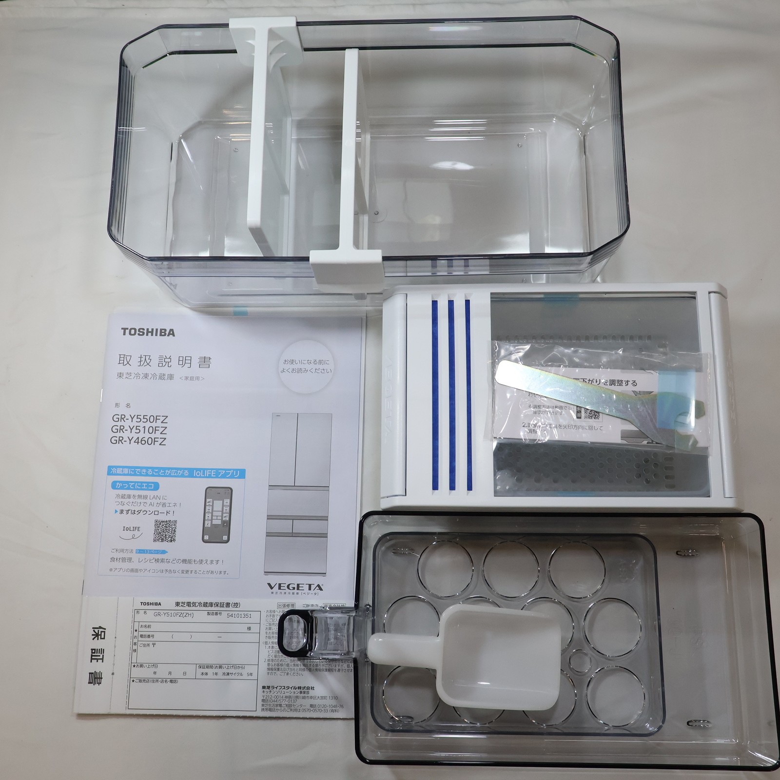 〔付属品〕取扱説明書、給水タンク一式、卵スタンド、フリーケース、アルミトレイ(チルド)、使い切り野菜BOX、おそうじ口のフタ、アイスシャベル、アルミトレイ(冷凍室)、収納ケース、収納ケース仕切り×2、調整脚×2、調整脚用工具、前面グリル