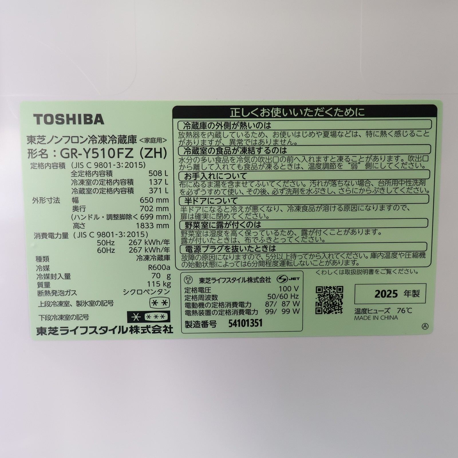 総有効内容量 508L