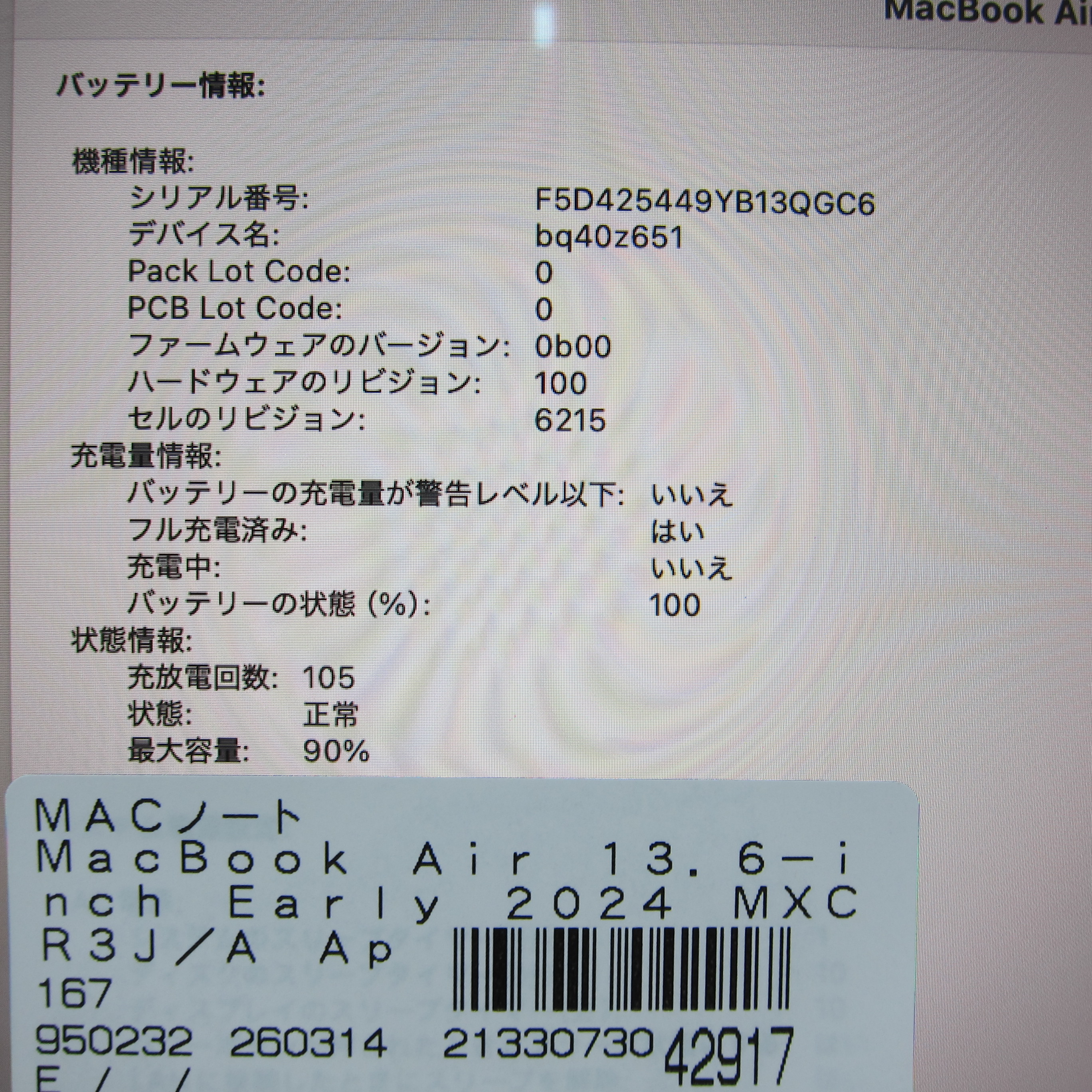 〔中古品〕 MacBook Air 13.6-inch Early-2024 MXCR3J/A Apple M3 8コアCPU_10コアGPU 16GB SSD512GB スペースグレイ 〔15.3 Sequoia〕 [グラフィック:オンボード/JISキーボード]