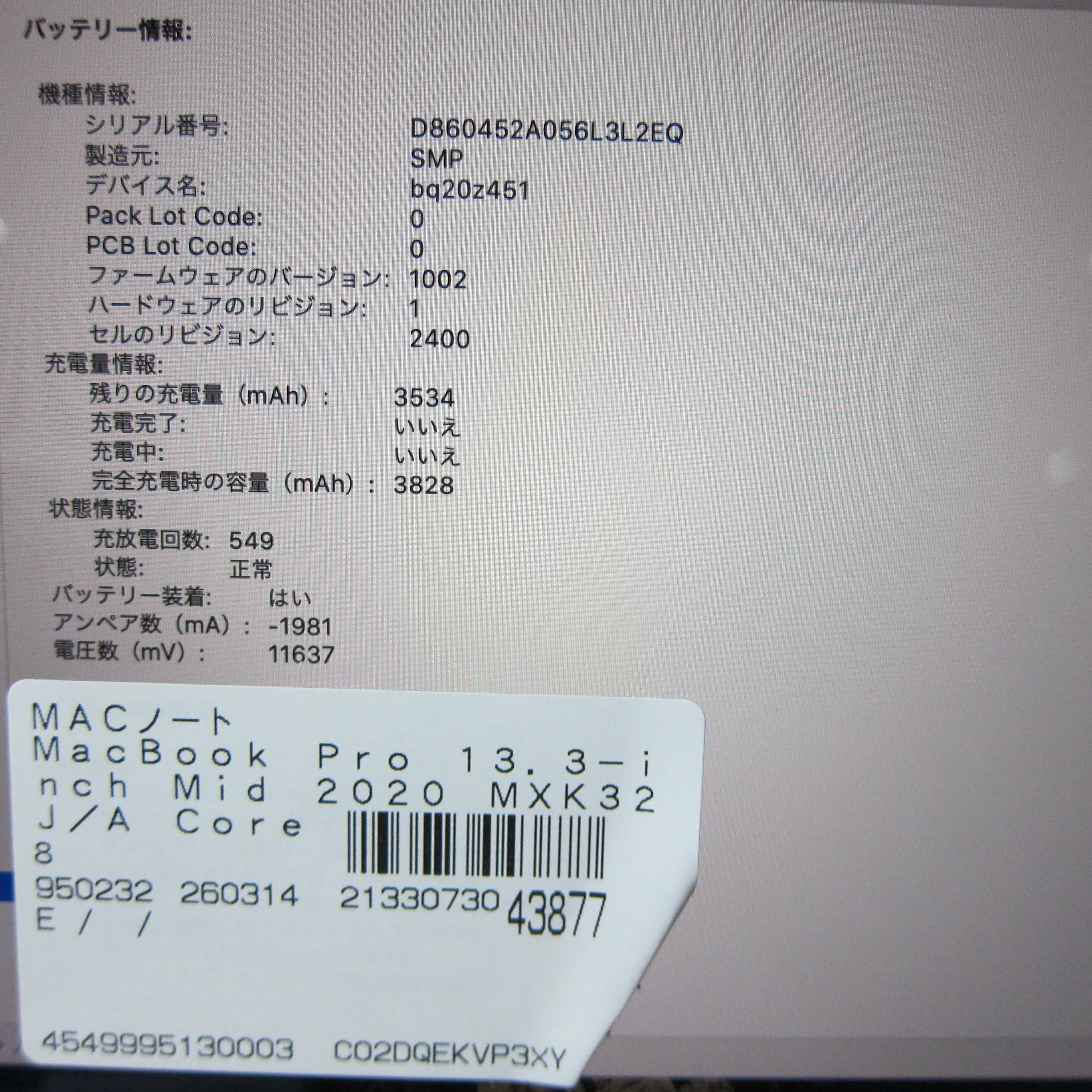 〔中古品〕 MacBook Pro 13.3-inch Mid-2020 MXK32J/A Core_i5 1.4GHz 8GB SSD256GB スペースグレイ 〔10.15 Catalina〕 [グラフィック:Intel Iris Plus Graphics 645(CPU内蔵)/USキーボード]