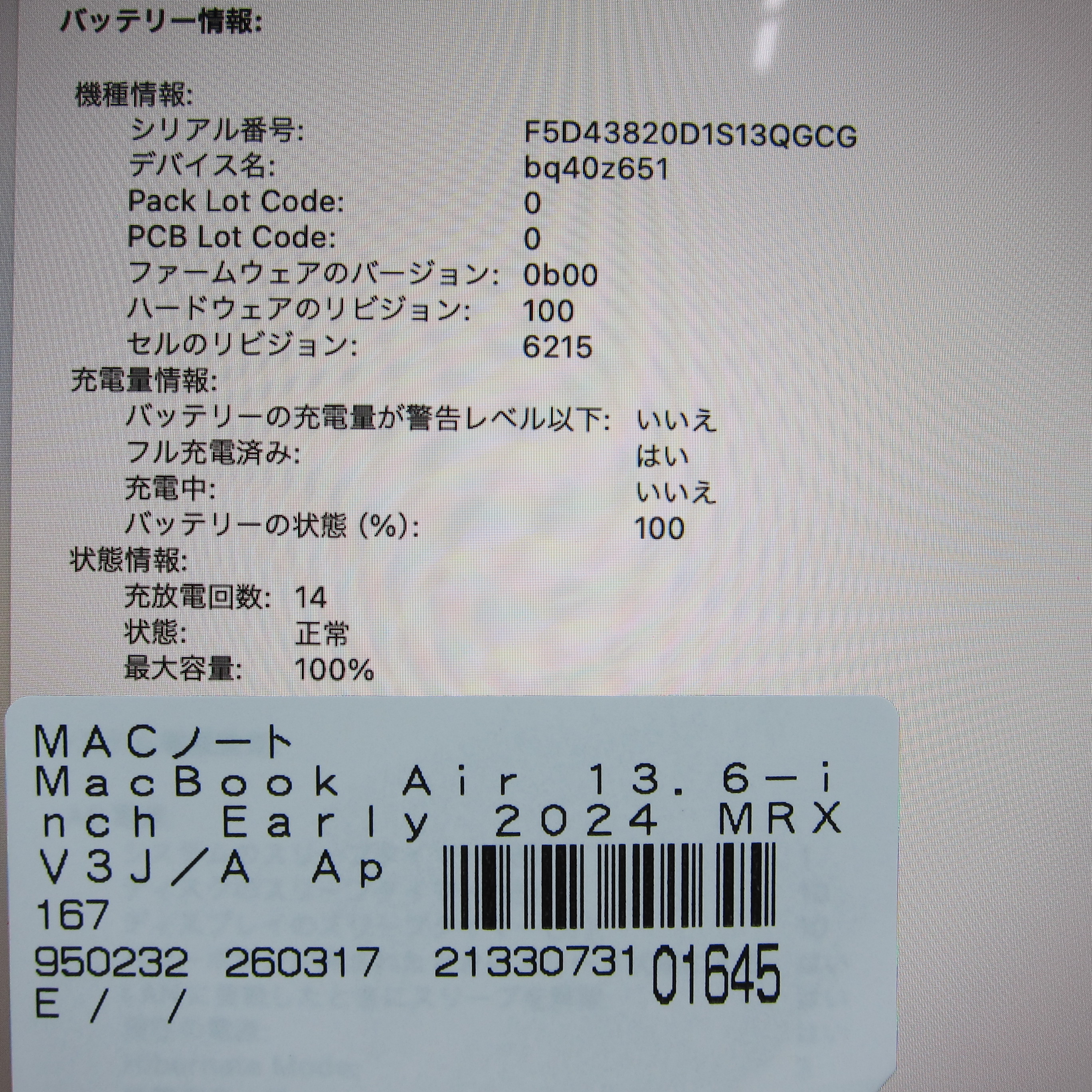 〔中古品〕 MacBook Air 13.6-inch Early-2024 MRXV3J/A Apple M3 8コアCPU_8コアGPU 8GB SSD256GB ミッドナイト 〔14.7 Sonoma〕 [グラフィック:オンボード/JISキーボード]