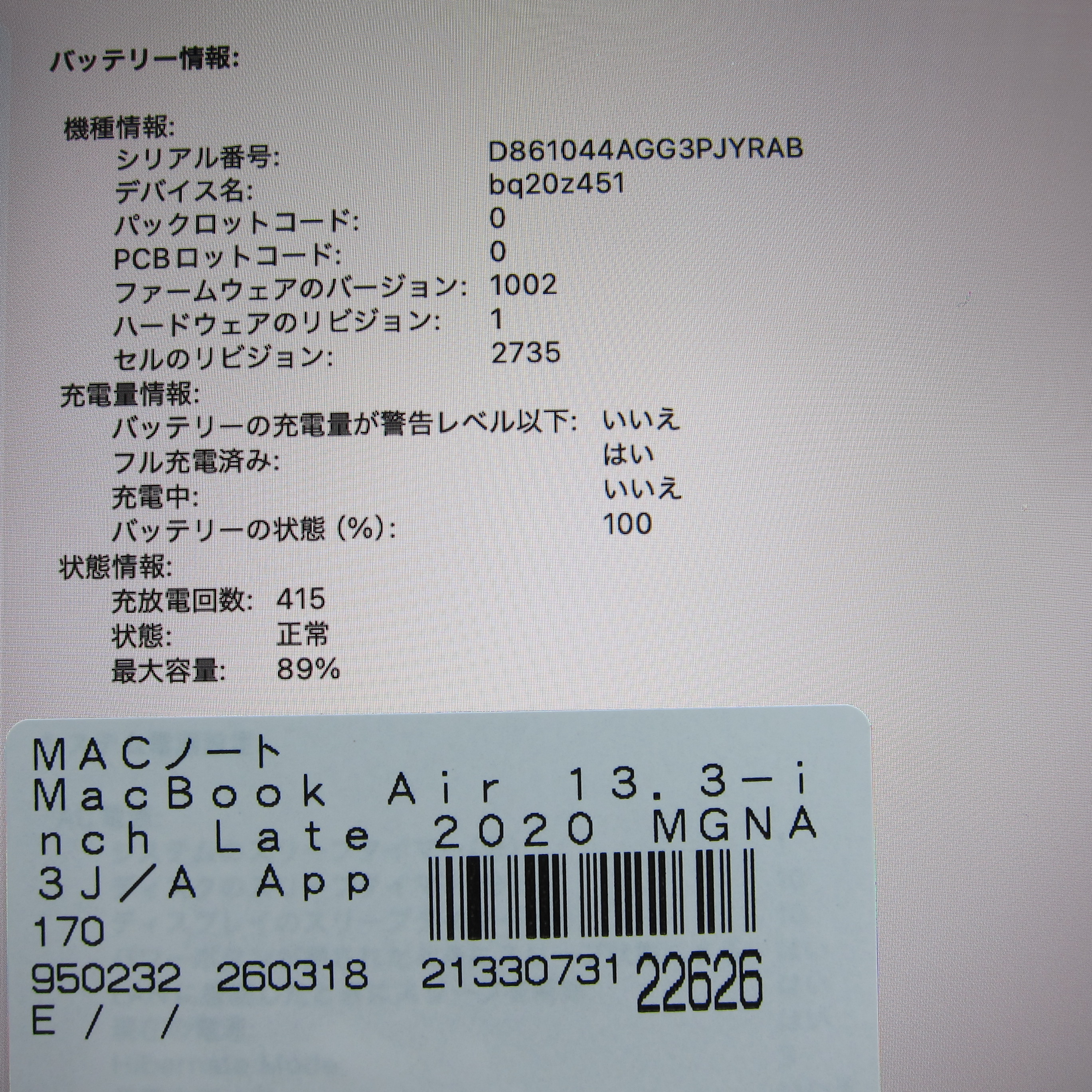 〔中古品〕 MacBook Air 13.3-inch Late-2020 MGNA3J/A Apple M1 8コアCPU_8コアGPU 16GB SSD2TB シルバー 〔26.2 Tahoe〕 [グラフィック:オンボード/JISキーボード]