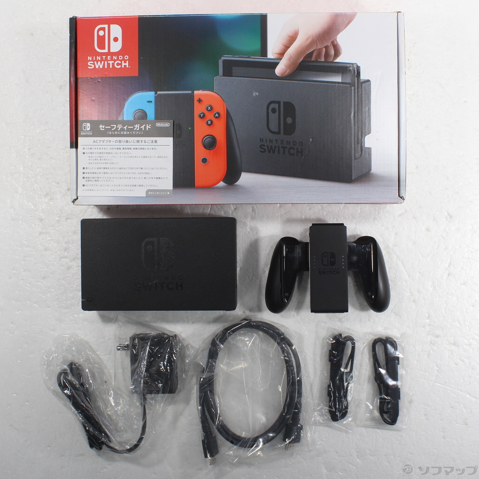 〔付属品〕箱、セーフティーガイド、ACアダプター、Joy-Conグリップ、Joy-Con 左 ネオンブルー、Nintendo Switchドック、Joy-Conストラップ 左、Joy-Conストラップ 右、背面スタンド、HDMIケーブル(1.5m)