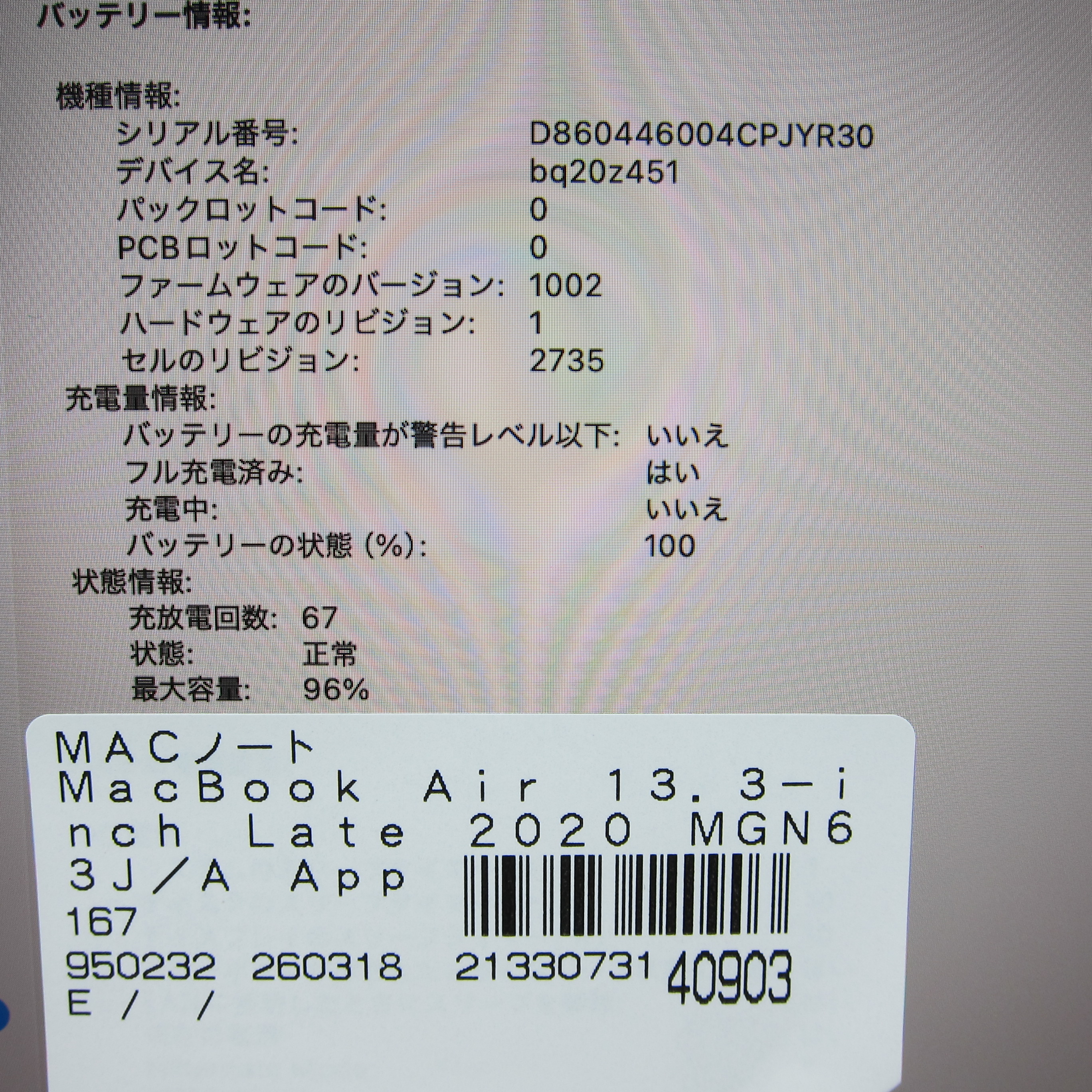 〔中古品〕 MacBook Air 13.3-inch Late-2020 MGN63J/A Apple M1 8コアCPU_7コアGPU 8GB SSD256GB スペースグレイ 〔macOS v26.3.2〕 [グラフィック:オンボード/JISキーボード]