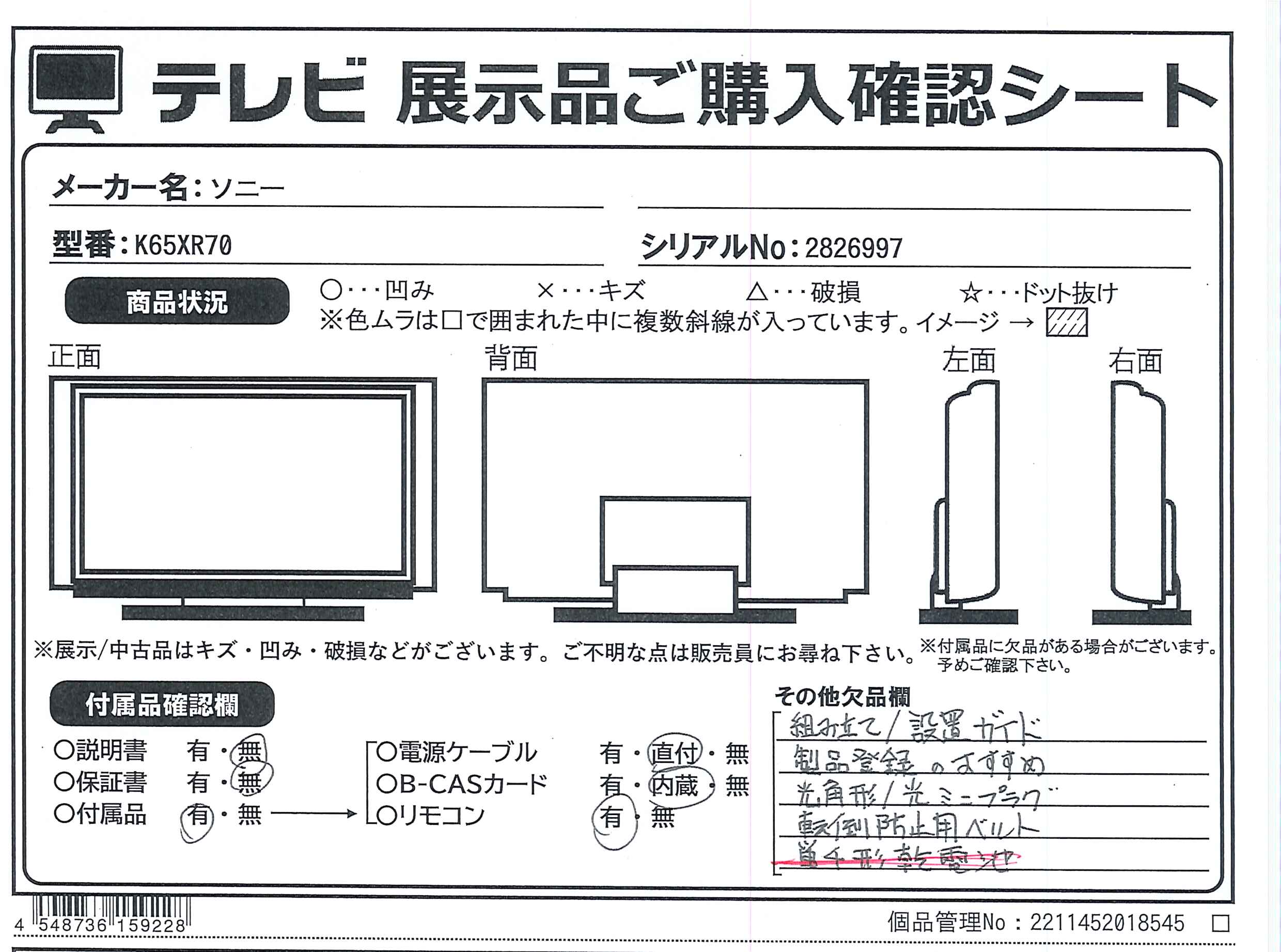 ▼同型番の新品商品はこちら![]() SONY(ソニー) 液晶テレビ BRAVIA(ブラビア) K-65XR70 [65V型 /Bluetooth対応 /4K対応 /BS・CS 4Kチューナー内蔵 /YouTube対応] ¥336,600(税込) 0ポイントサービス 在庫あり |