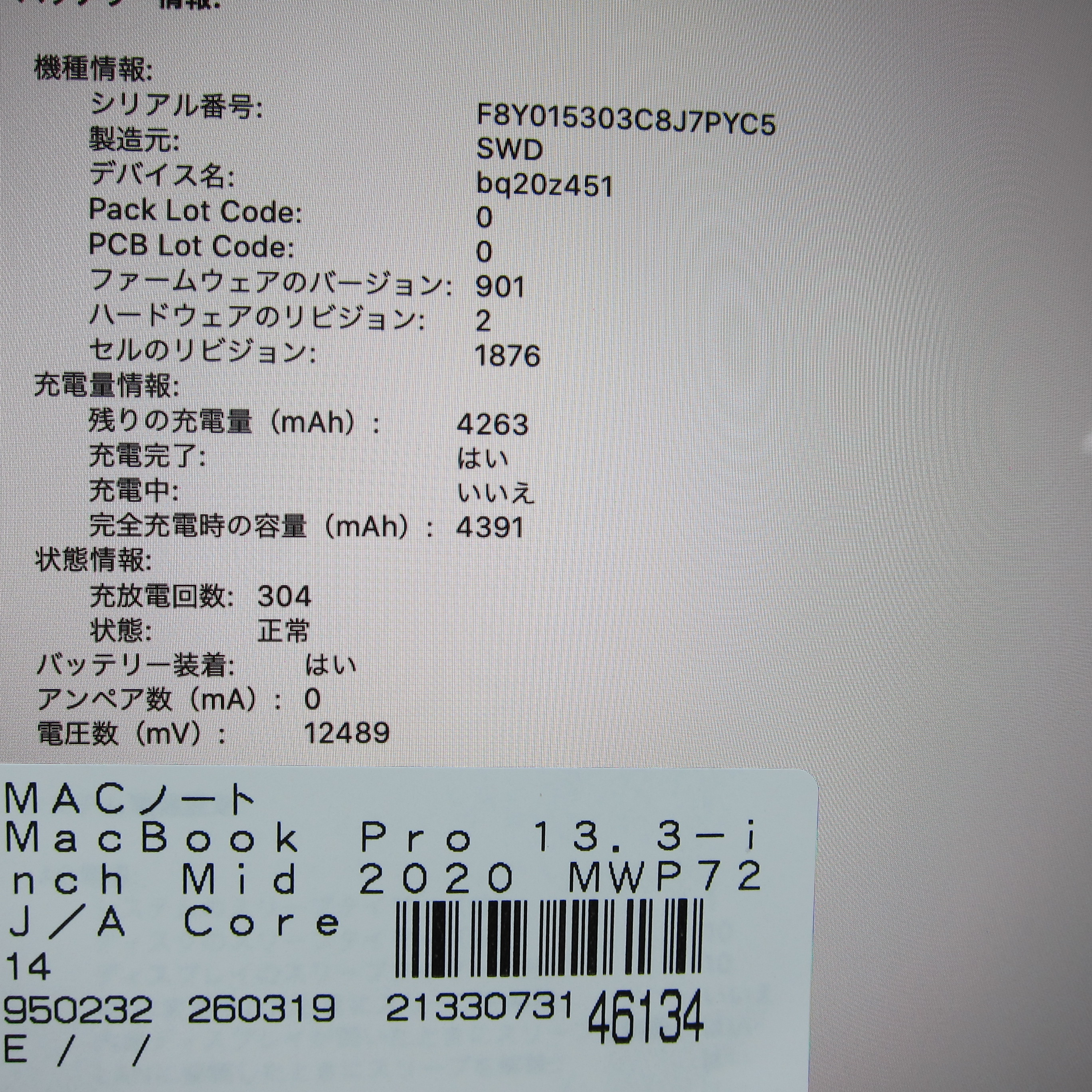 〔中古品〕 MacBook Pro 13.3-inch Mid-2020 MWP72J/A Core_i5 2.0GHz 16GB SSD512GB シルバー 〔10.15 Catalina〕 [グラフィック:Intel Iris Plus Graphics/JISキーボード]
