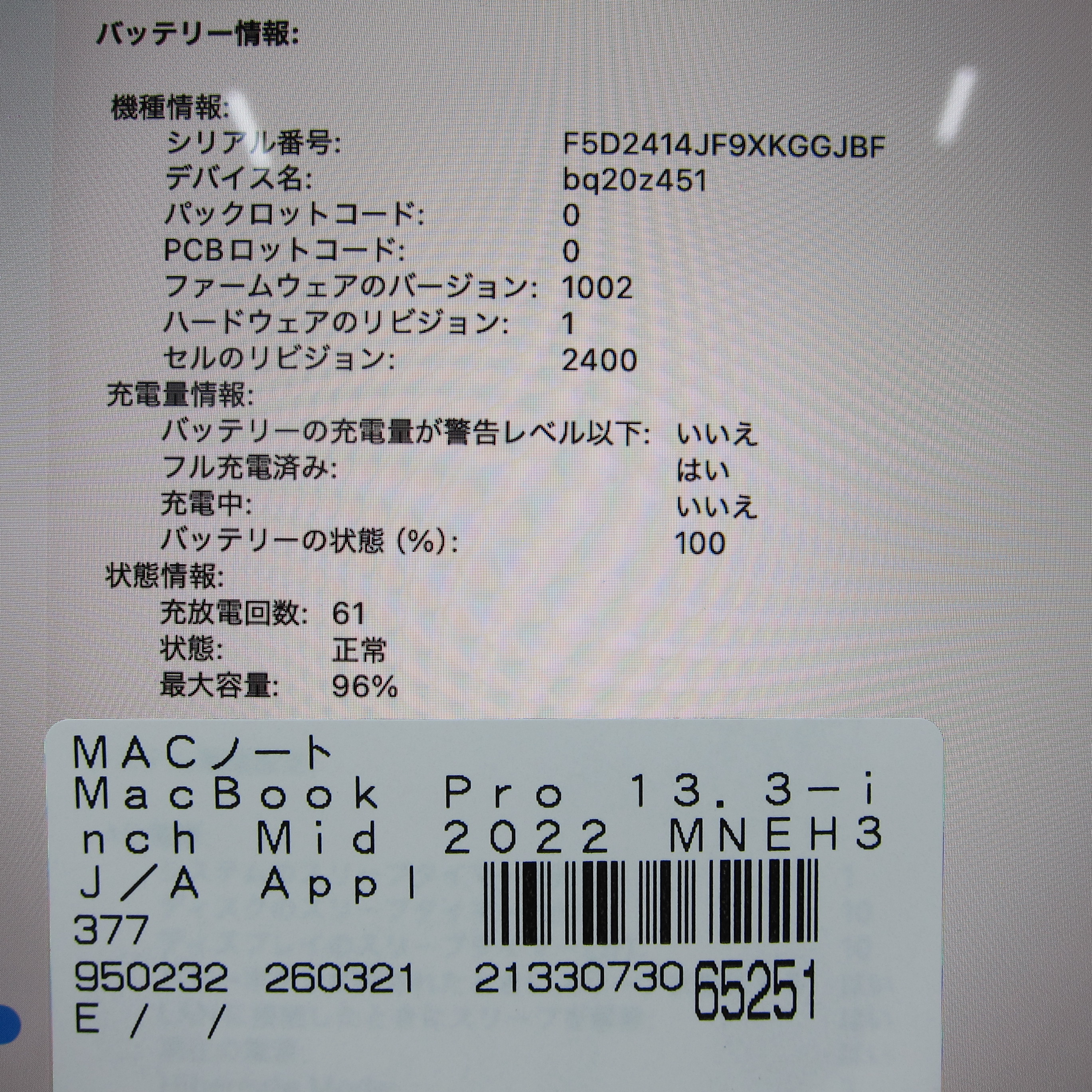 〔中古品〕 MacBook Pro 13.3-inch Mid-2022 MNEH3J/A Apple M2 8コアCPU_10コアGPU 8GB SSD256GB スペースグレイ 〔macOS v26.3.2〕 [グラフィック:オンボード/JISキーボード]