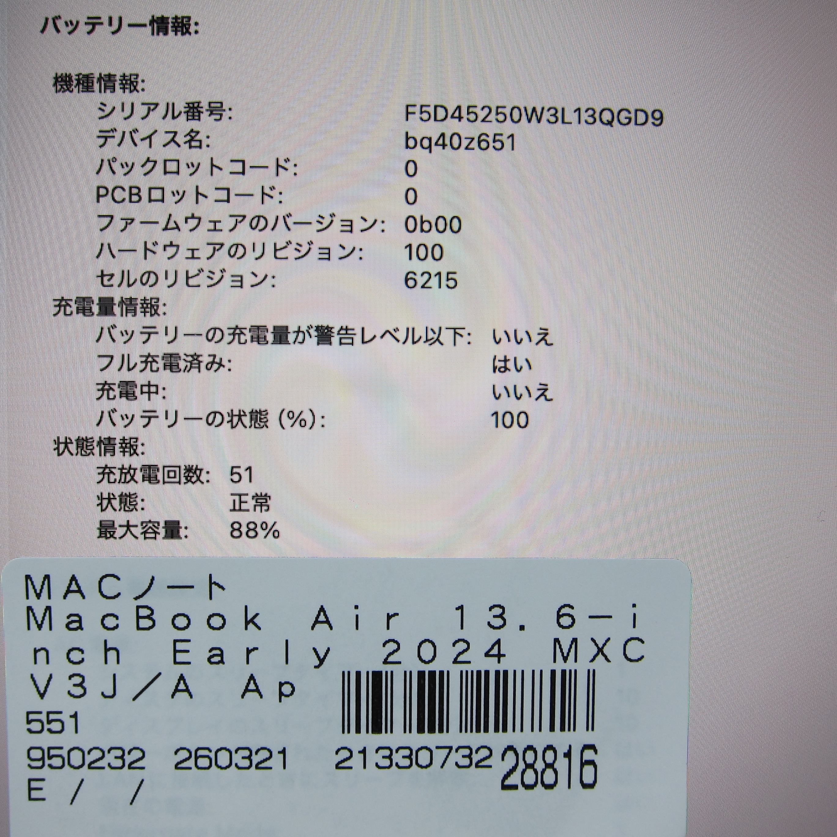 〔中古品〕 MacBook Air 13.6-inch Early-2024 MXCV3J/A Apple M3 8コアCPU_10コアGPU 24GB SSD512GB ミッドナイト 〔26.3 Tahoe〕 [グラフィック:オンボード/USキーボード]