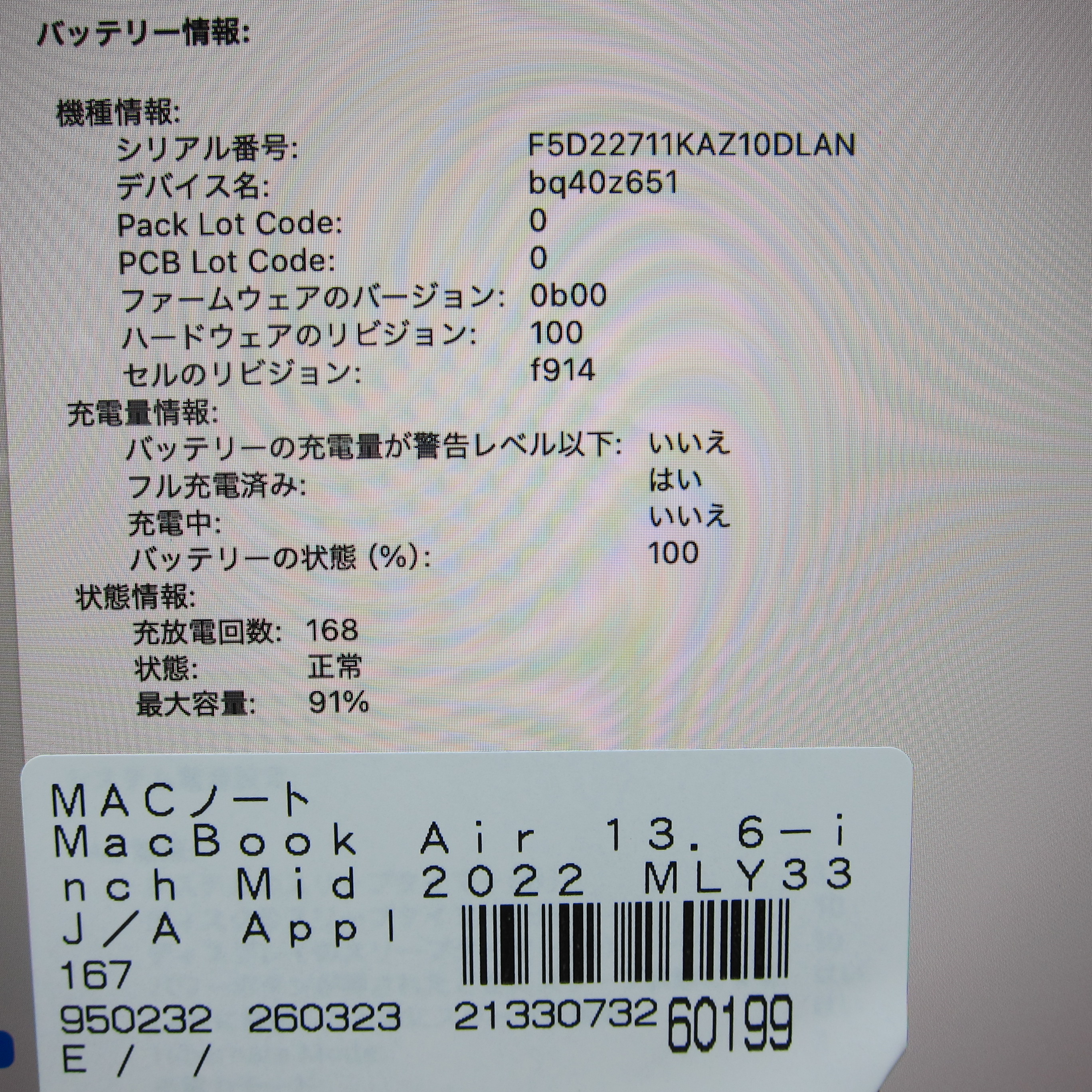 〔中古品〕 MacBook Air 13.6-inch Mid-2022 MLY33J/A Apple M2 8コアCPU_8コアGPU 16GB SSD512GB ミッドナイト 〔15.7 Sequoia〕 [グラフィック:オンボード/JISキーボード]