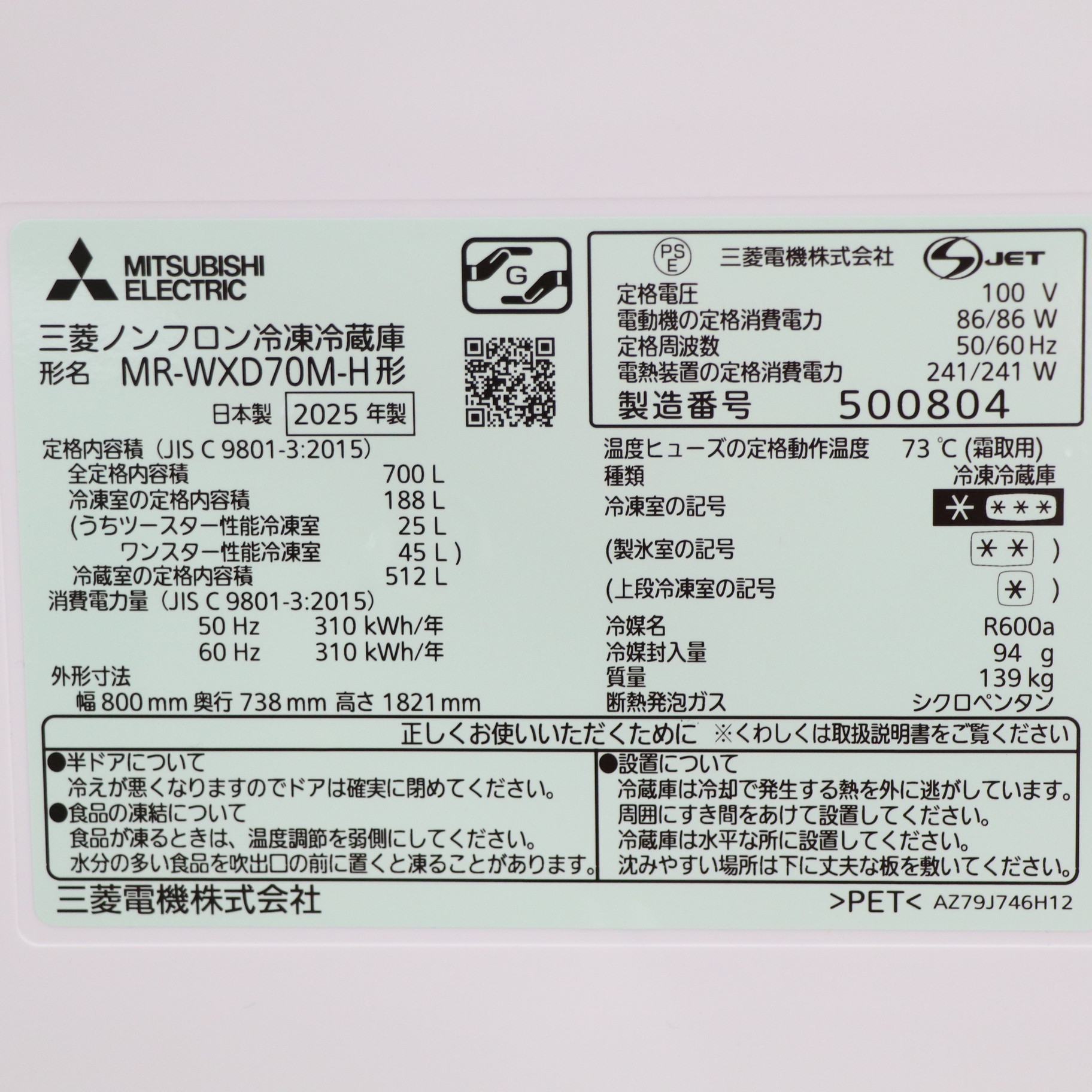 〔展示品〕 冷蔵庫 置けるスマート大容量 WXDシリーズ(プレミアムフレンチモデル) グランドアンバーグレー MR-WXD70M-H [幅80cm /700L /6ドア /観音開きタイプ /2025年]