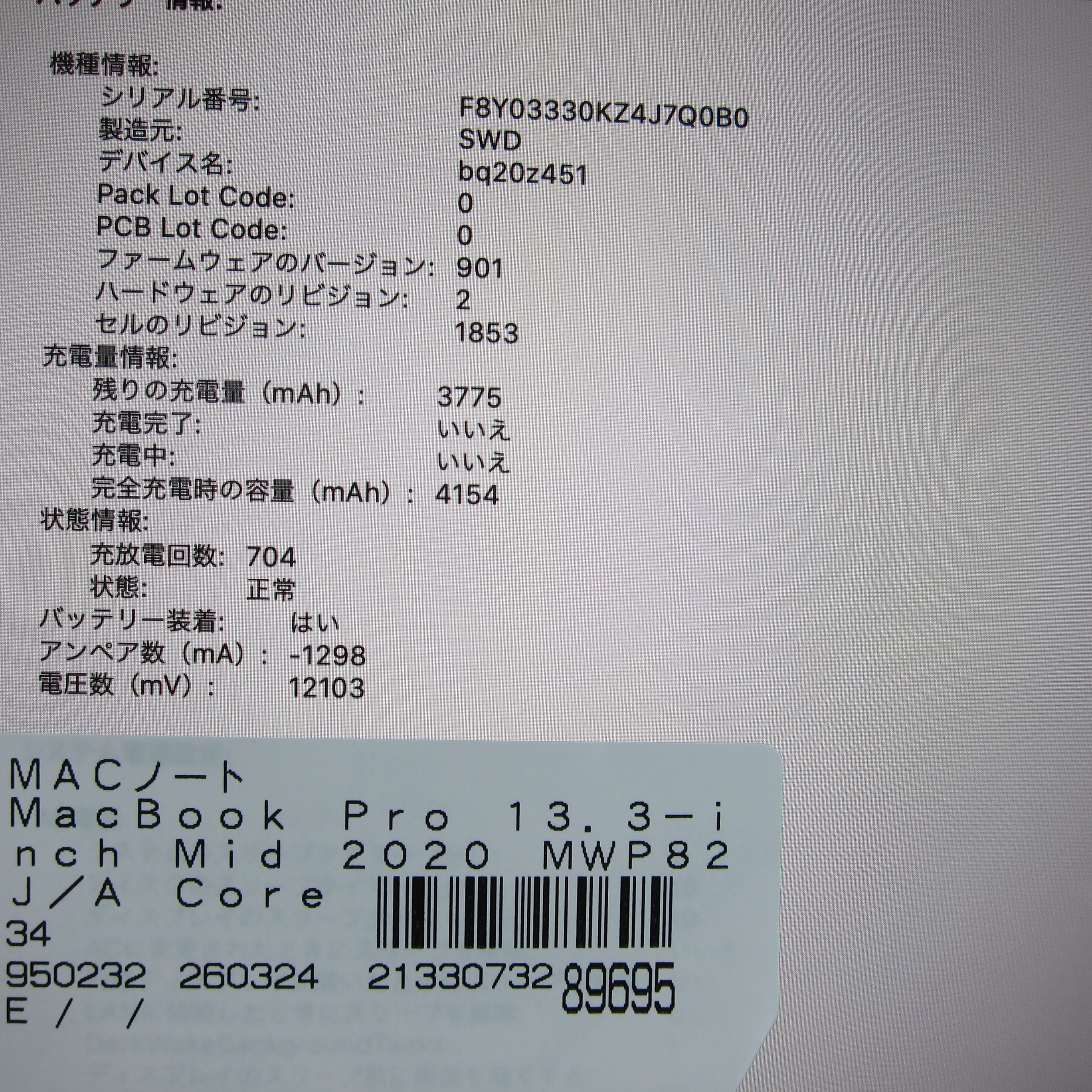 〔中古品〕 MacBook Pro 13.3-inch Mid-2020 MWP82J/A Core_i7 2.3GHz 16GB SSD1TB シルバー 〔10.15 Catalina〕 [グラフィック:Intel Iris Plus Graphics/JISキーボード]