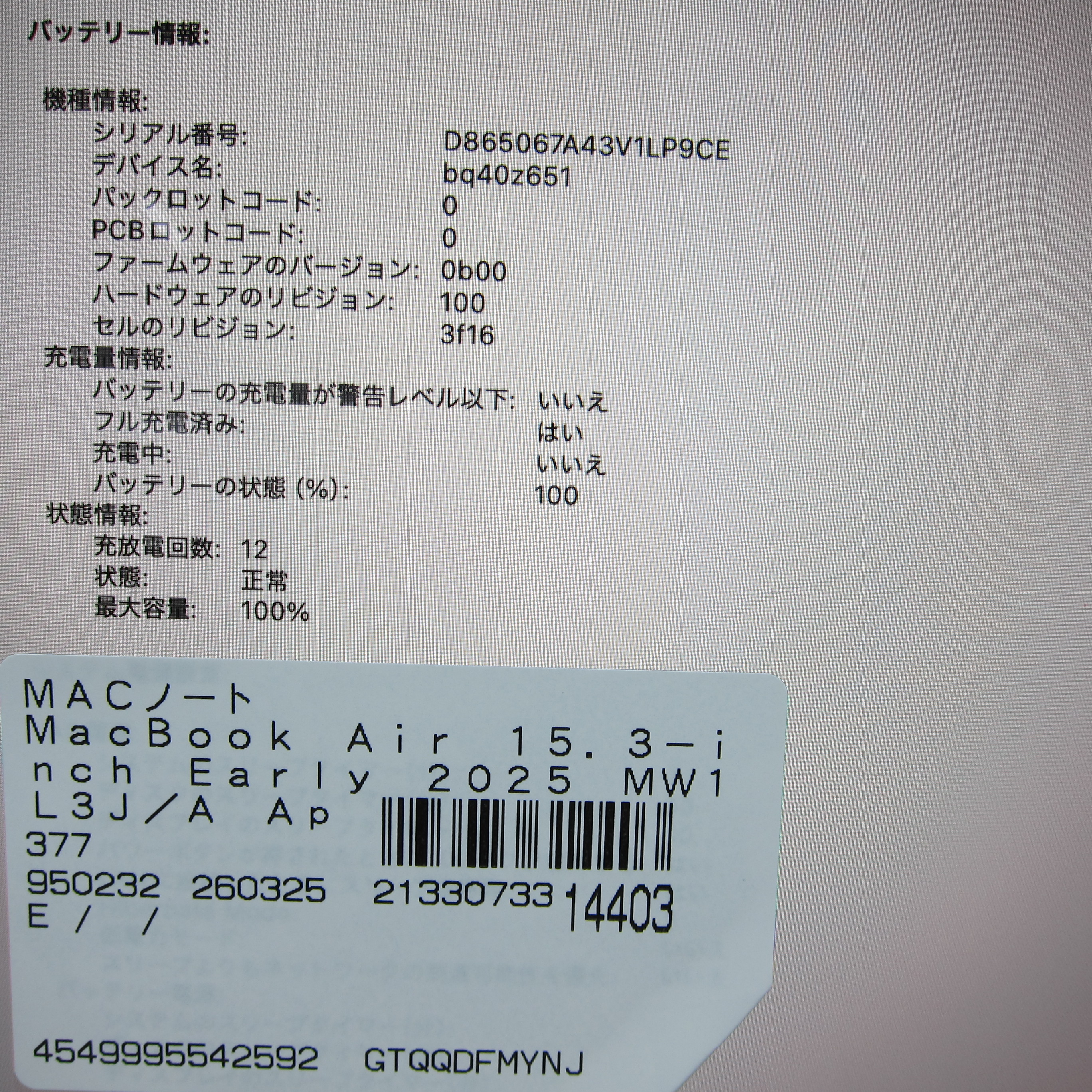 〔中古品〕 MacBook Air 15.3-inch Early-2025 MW1L3J/A Apple M4 10コアCPU_10コアGPU 16GB SSD256GB ミッドナイト 〔26.3 Tahoe〕 [グラフィック:オンボード/JISキーボード]