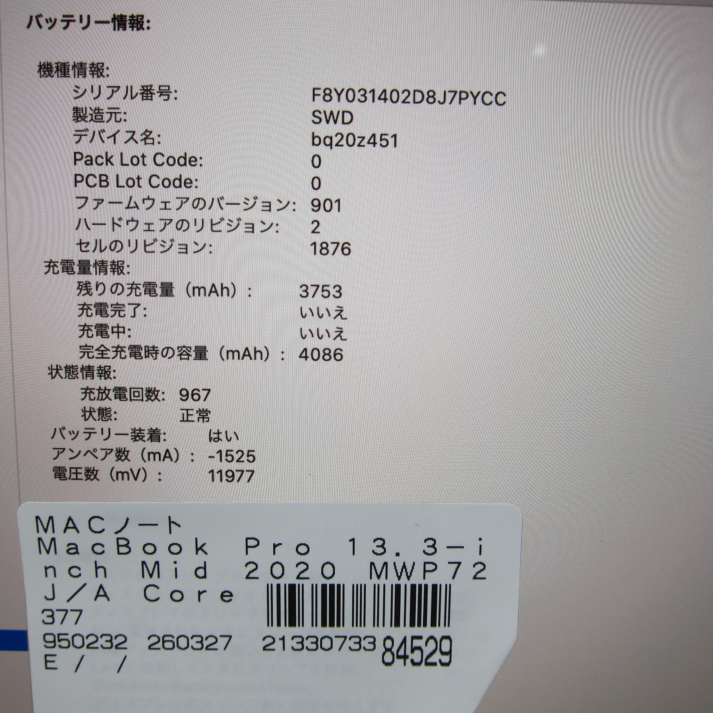 〔中古品〕 MacBook Pro 13.3-inch Mid-2020 MWP72J/A Core_i5 2.0GHz 16GB SSD512GB シルバー 〔10.15 Catalina〕 [グラフィック:Intel Iris Plus Graphics/JISキーボード]