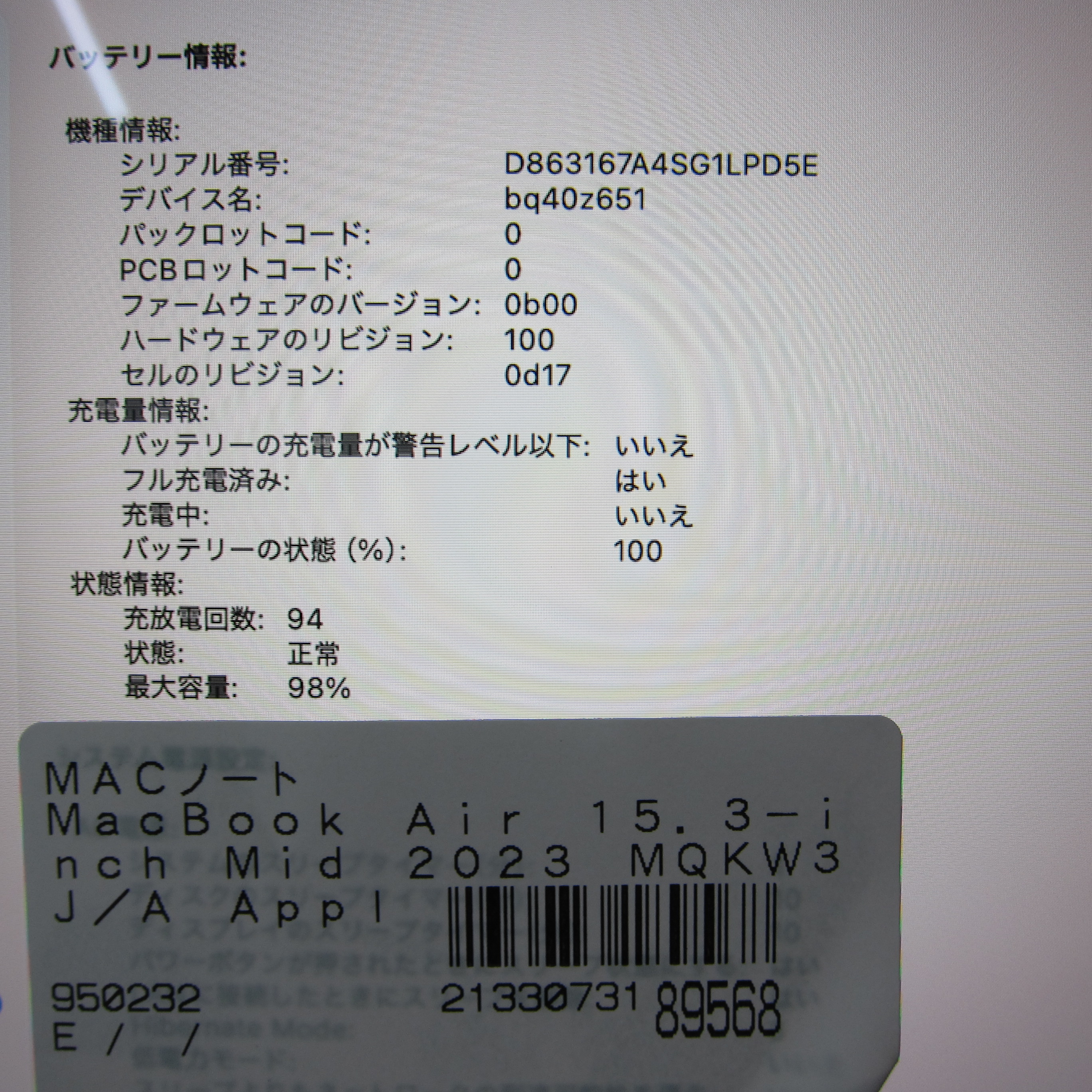〔展示品〕 MacBook Air 15.3-inch Mid-2023 MQKW3J/A Apple M2 8コアCPU_10コアGPU 8GB SSD256GB ミッドナイト 〔macOS v26.3.2〕 [グラフィック:オンボード/JISキーボード]