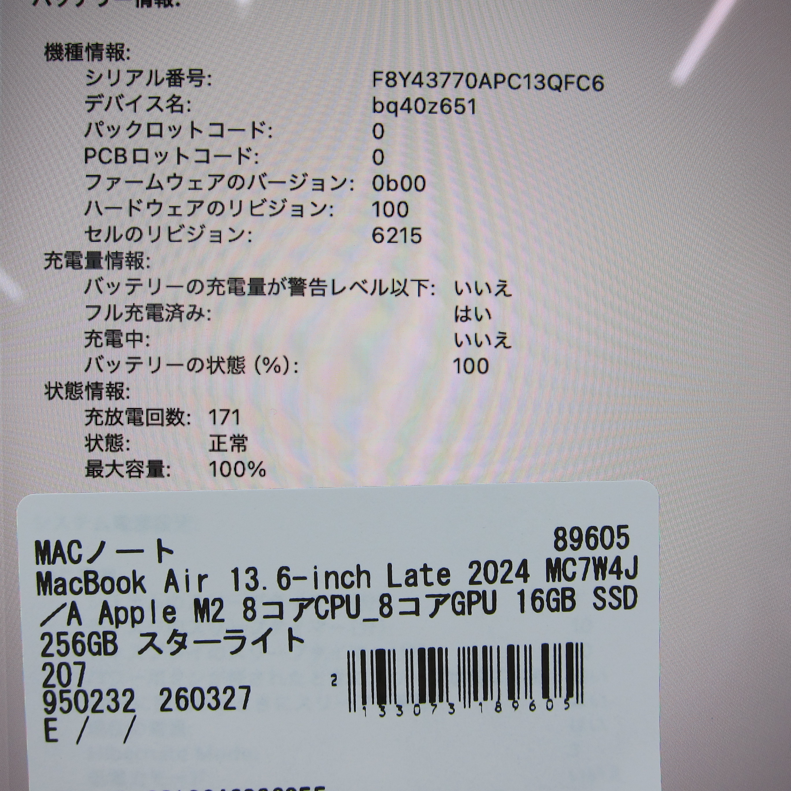 〔展示品〕 MacBook Air 13.6-inch Late-2024 MC7W4J/A Apple M2 8コアCPU_8コアGPU 16GB SSD256GB スターライト 〔macOS v26.3.2〕 [グラフィック:オンボード/JISキーボード]