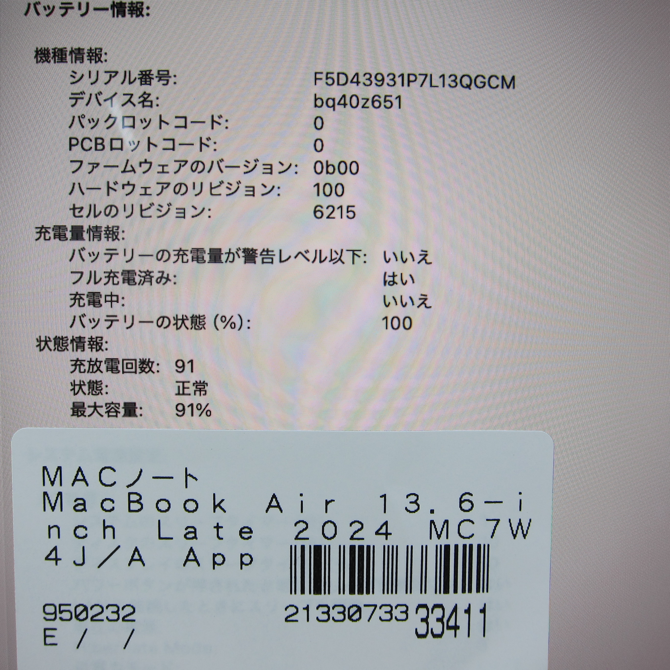 〔展示品〕 MacBook Air 13.6-inch Late-2024 MC7W4J/A Apple M2 8コアCPU_8コアGPU 16GB SSD256GB スターライト 〔macOS v26.3.2〕 [グラフィック:オンボード/JISキーボード]