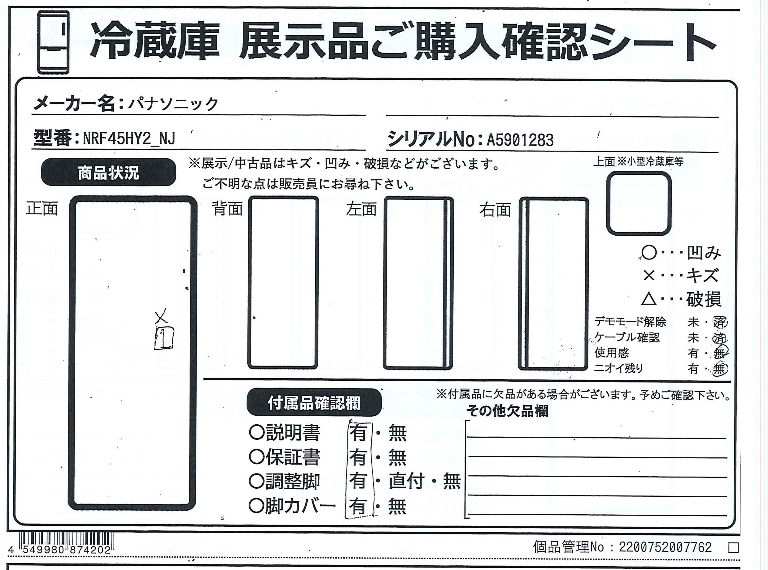 中古商品ランクについて 付属品・商品状態について 〔付属品〕取扱説明書、脚カバー、調節脚×2、給水タンク一式、卵トレイ、アルミプレート(パーシャル/チルド切替室)、製氷皿、アイスシャベル、アルミプレート(クーリングアシストルーム)