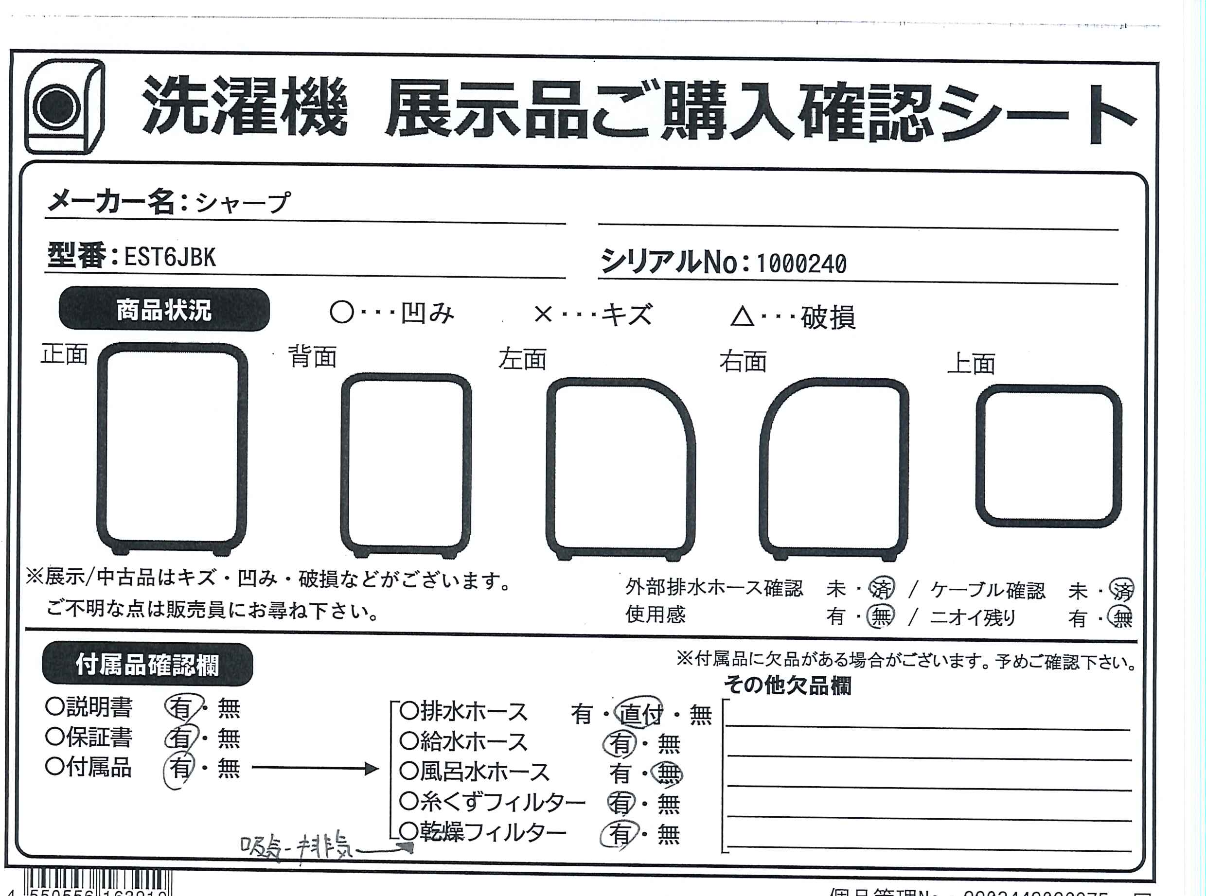 中古商品ランクについて 付属品・商品状態について 〔付属品〕説明書、給水ホース、水栓つぎて、底カバー、底カバー取付用ネジ×6、底カバー取付説明書、据付チラシ