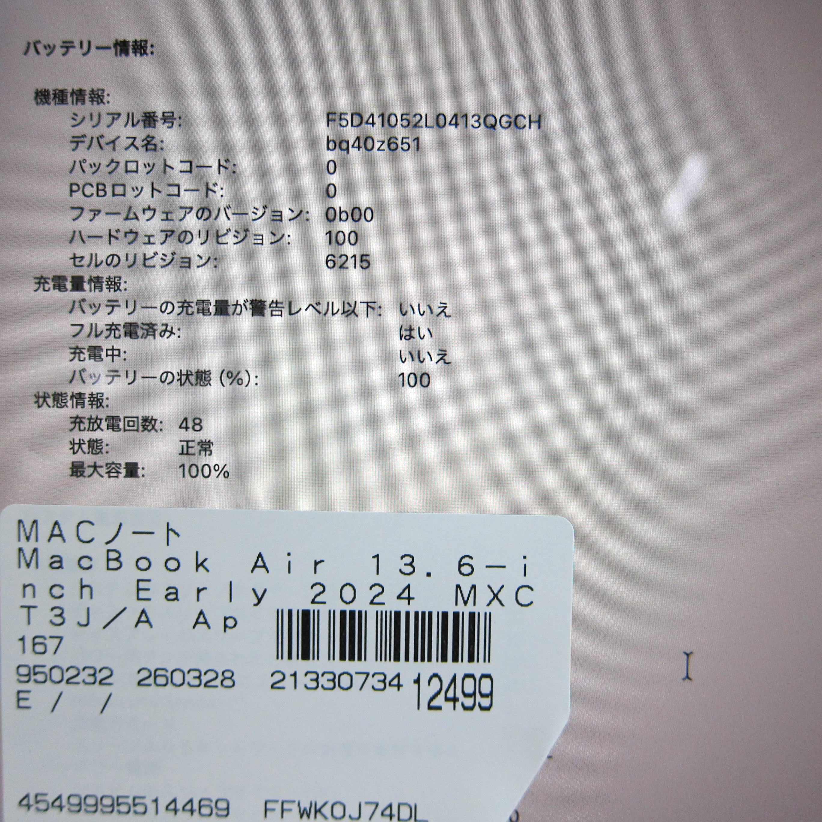 〔中古品〕 MacBook Air 13.6-inch Early-2024 MXCT3J/A Apple M3 8コアCPU_10コアGPU 24GB SSD1TB シルバー 〔26.3 Tahoe〕 [グラフィック:オンボード/JISキーボード]