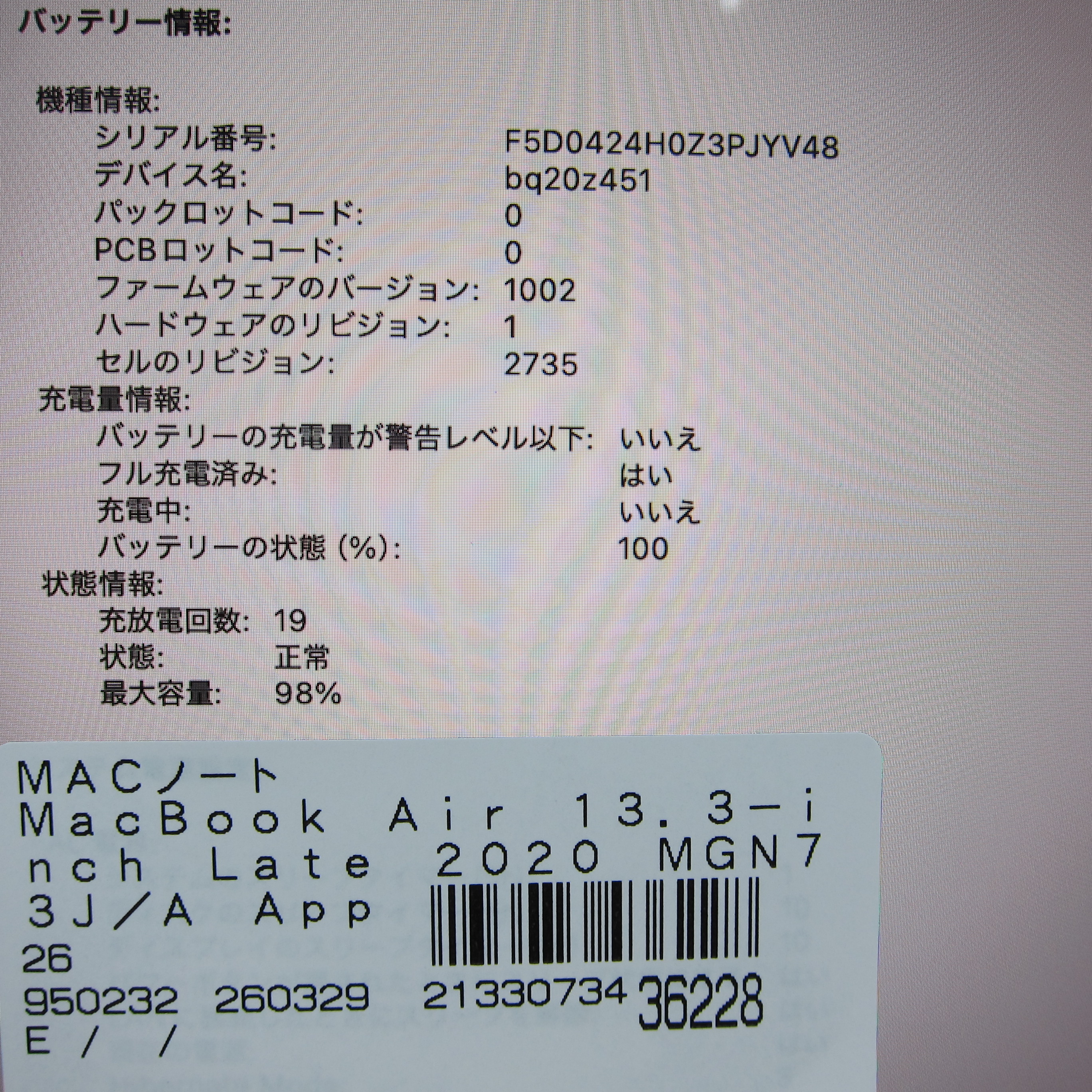 〔中古品〕 MacBook Air 13.3-inch Late-2020 MGN73J/A Apple M1 8コアCPU_8コアGPU 8GB SSD512GB スペースグレイ 〔26.3 Tahoe〕 [グラフィック:オンボード/JISキーボード]
