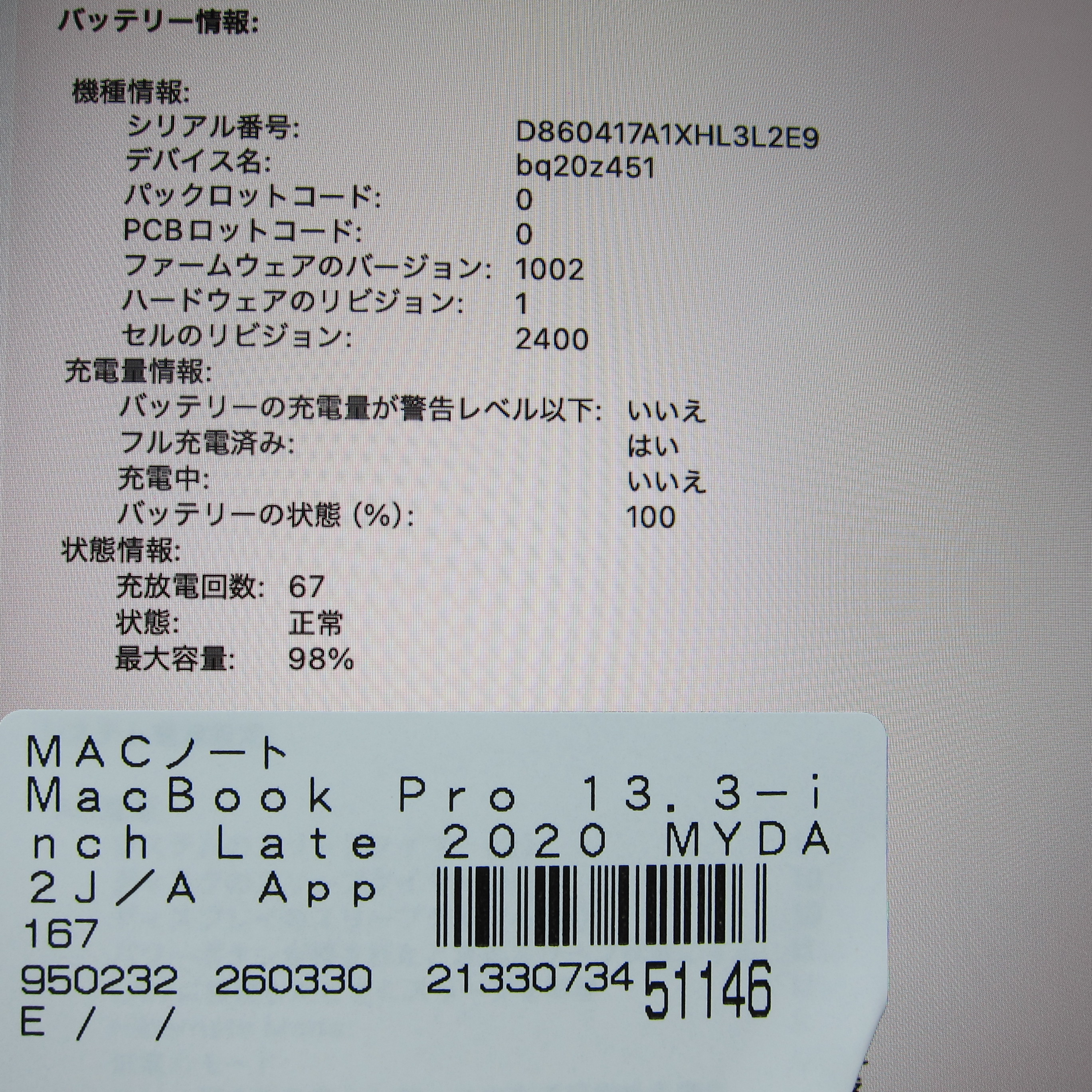 商品名 〔中古品〕 MacBook Pro 13.3-inch Late-2020 MYDA2J/A Apple M1 8コアCPU_8コアGPU 8GB SSD256GB シルバー 〔26.3 Tahoe〕 [グラフィック:オンボード/JISキーボード]