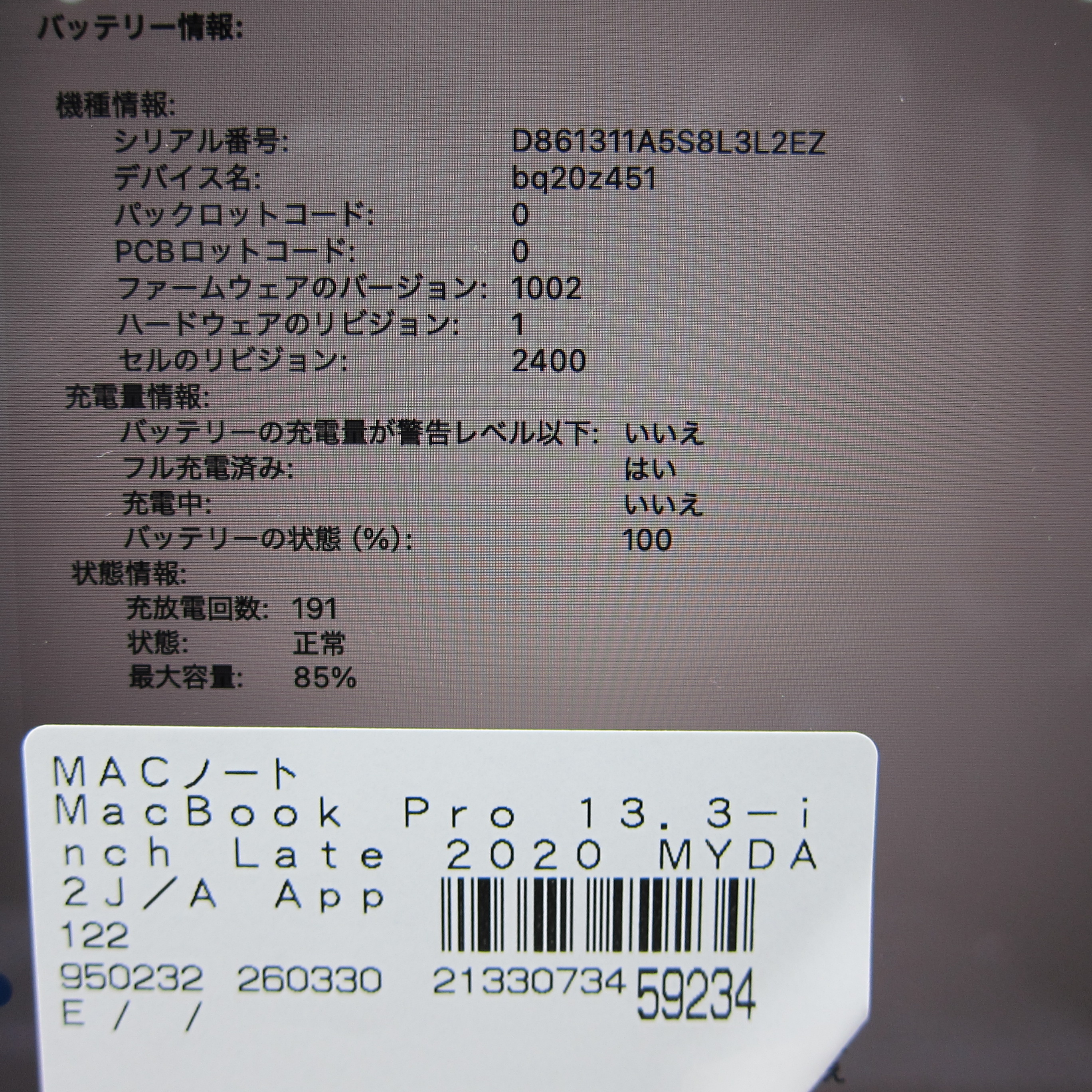 商品名 〔中古品〕 MacBook Pro 13.3-inch Late-2020 MYDA2J/A Apple M1 8コアCPU_8コアGPU 16GB SSD256GB シルバー 〔26.3 Tahoe〕 [グラフィック:オンボード/USキーボード]
