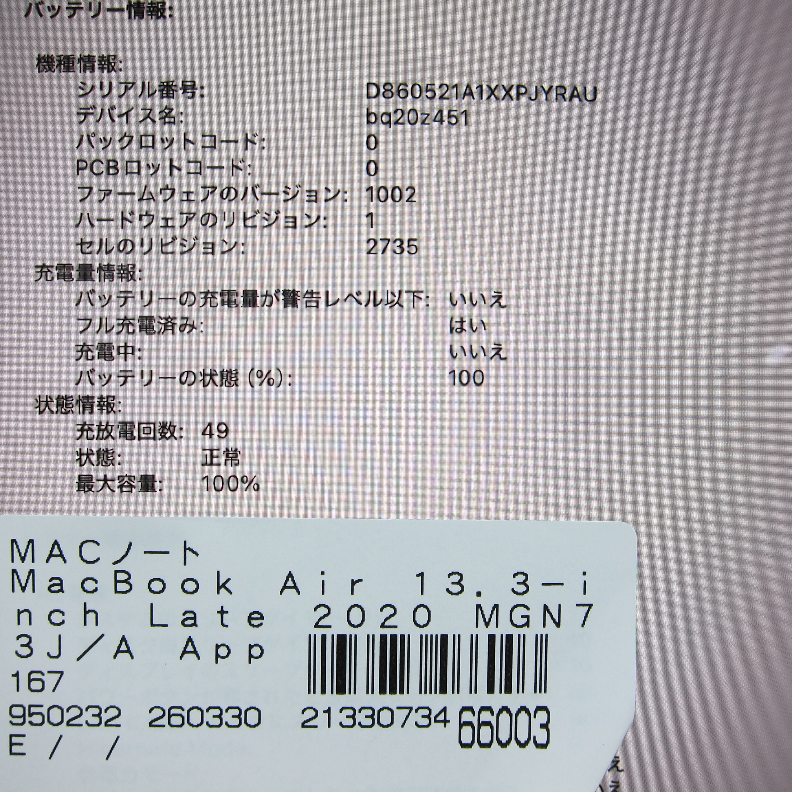 〔中古品〕 MacBook Air 13.3-inch Late-2020 MGN73J/A Apple M1 8コアCPU_8コアGPU 16GB SSD1TB スペースグレイ 〔26.3 Tahoe〕 [グラフィック:オンボード/JISキーボード]