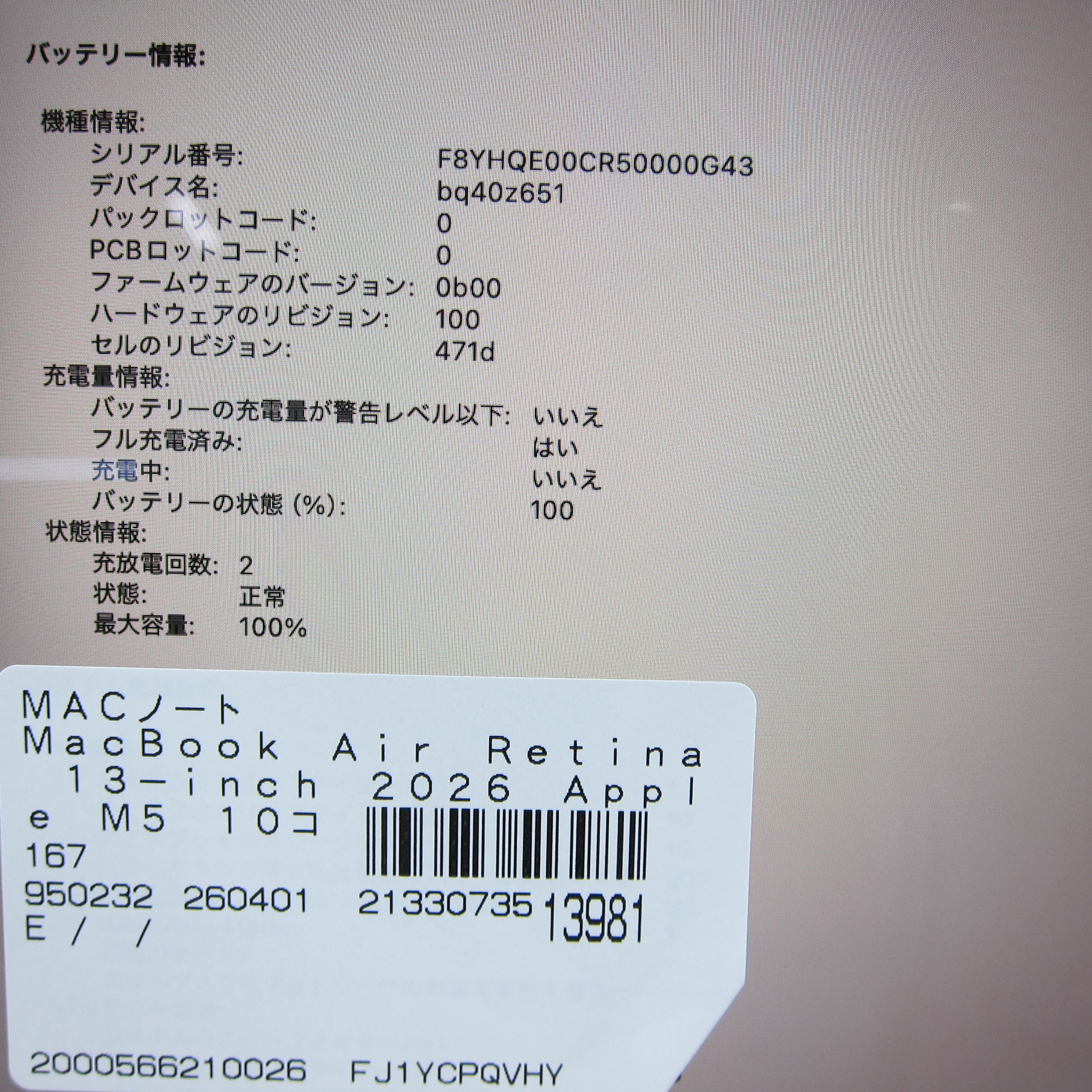 〔中古品〕 MacBook Air 13.6-inch Early-2026 MDHJ4J/A Apple M5 10コアCPU_10コアGPU 24GB SSD512GB スカイブルー 〔26.3 Tahoe〕 [グラフィック:オンボード/JISキーボード]